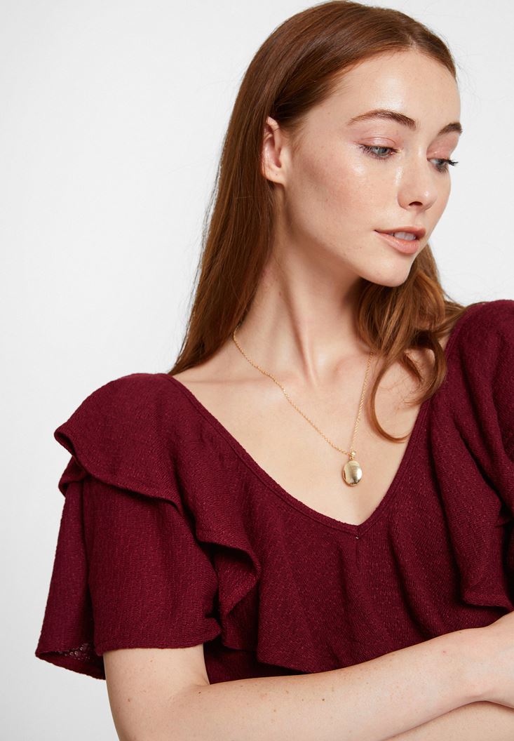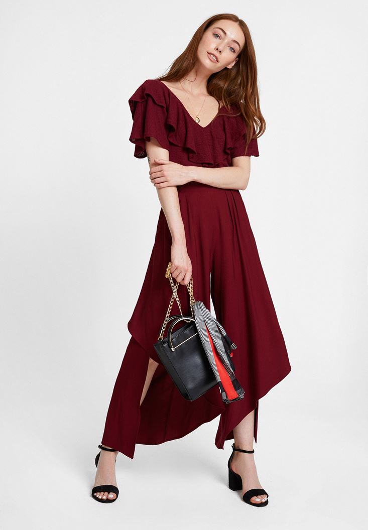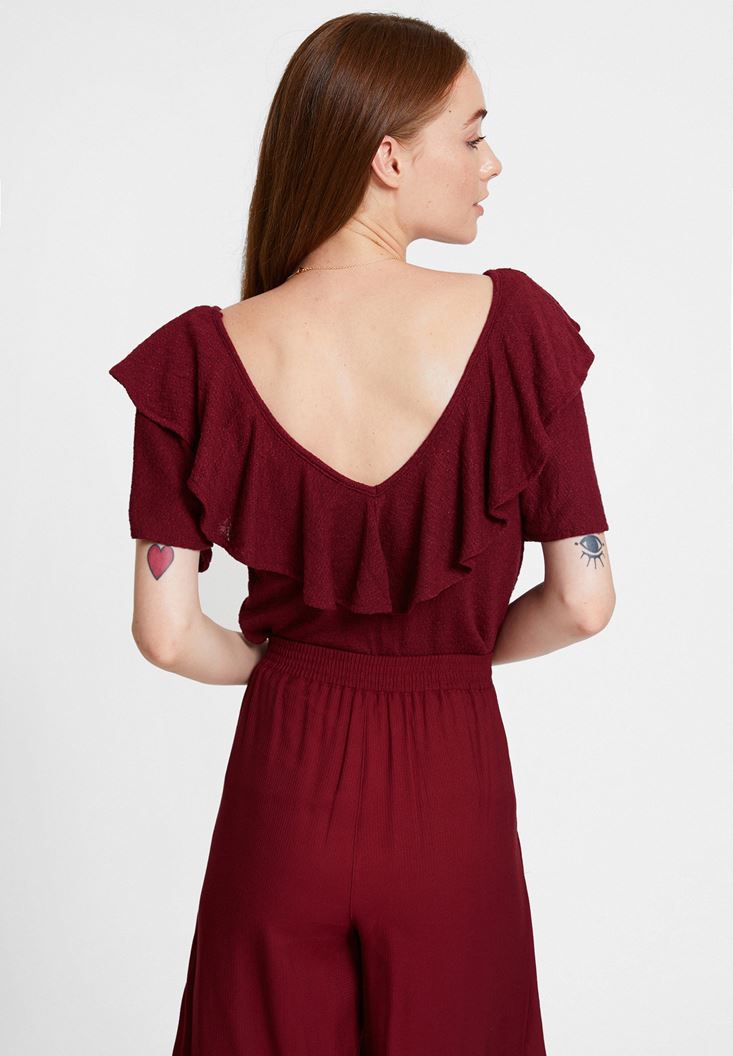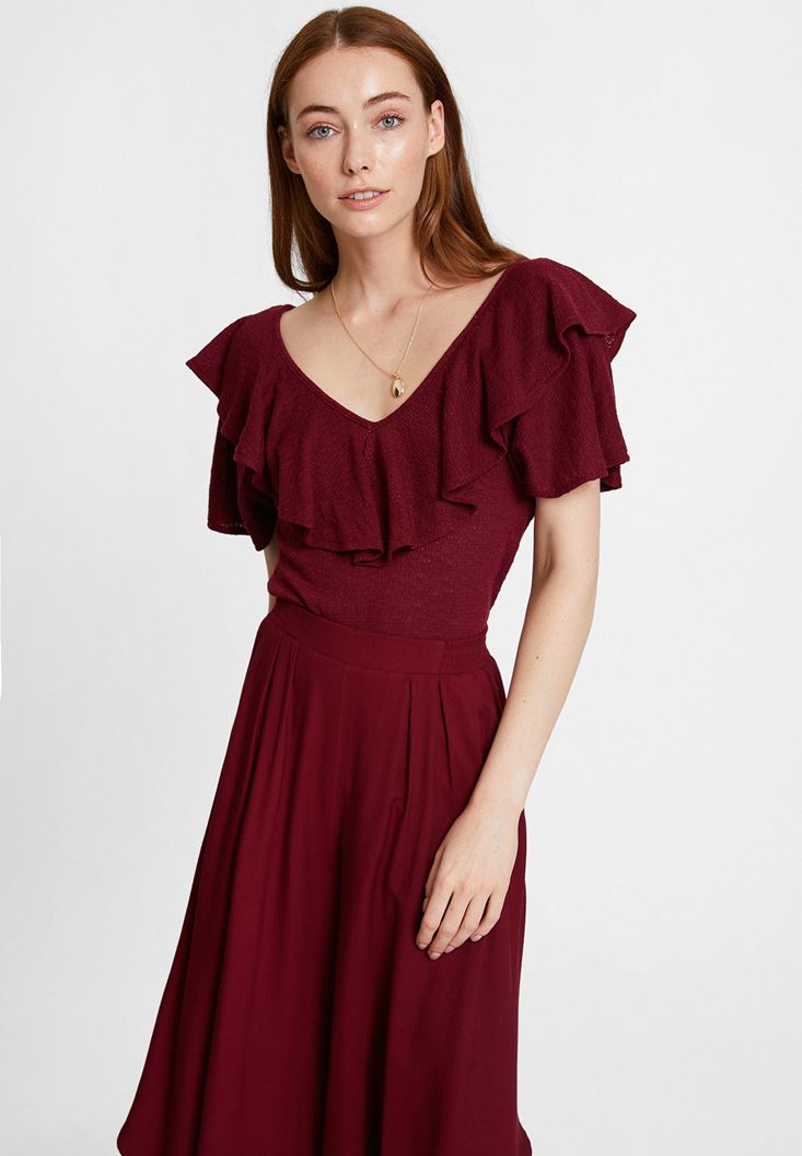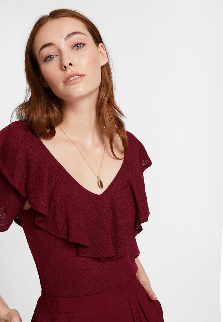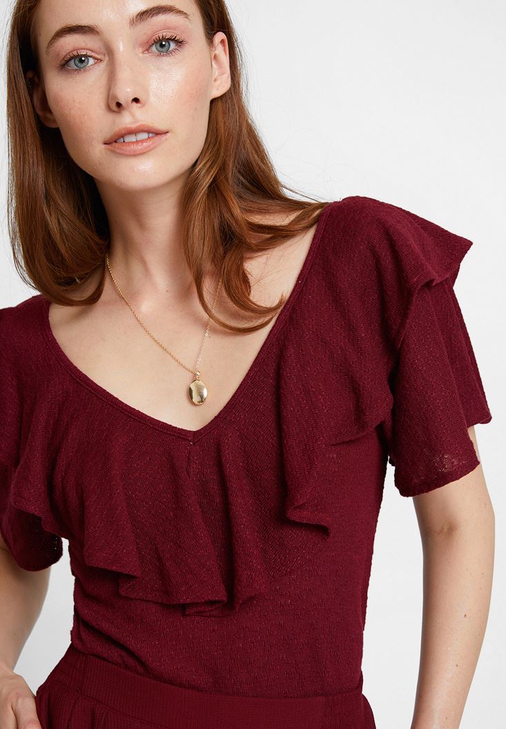 • Bayan Bordo V Yaka Fırfırlı Bluz