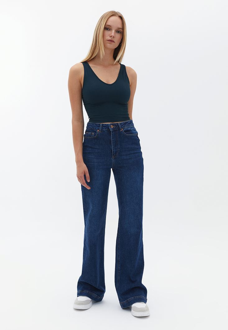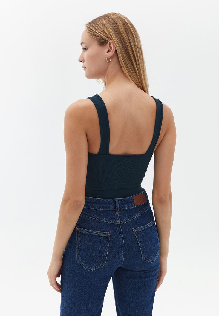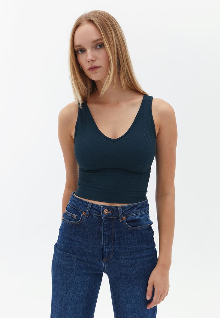 Seamless teknolojisi ile üretilen dikişsiz doku, bedeni saran ekstra esnek fit, V yaka, kalın askılı, crop kesim, sırt kısmı kare kesim, jakarlı doku.