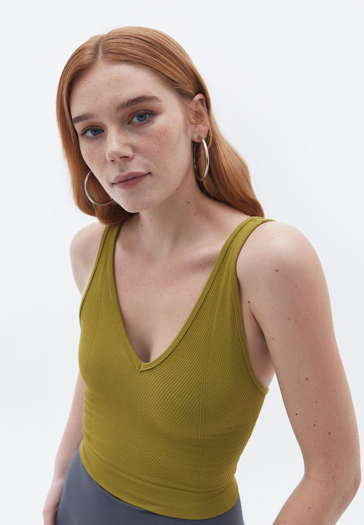 • Bayan Yeşil V Yaka Jakarlı Dikişsiz Atlet