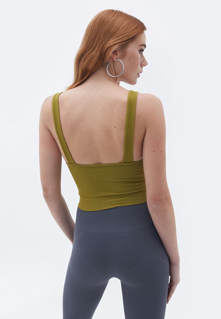 Seamless teknolojisi ile üretilen dikişsiz doku, bedeni saran ekstra esnek fit, V yaka, kalın askılı, crop kesim, sırt kısmı kare kesim, jakarlı doku.
