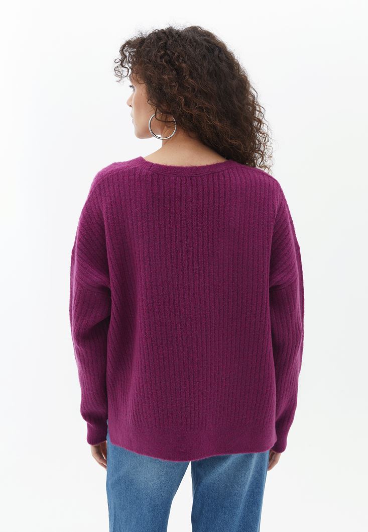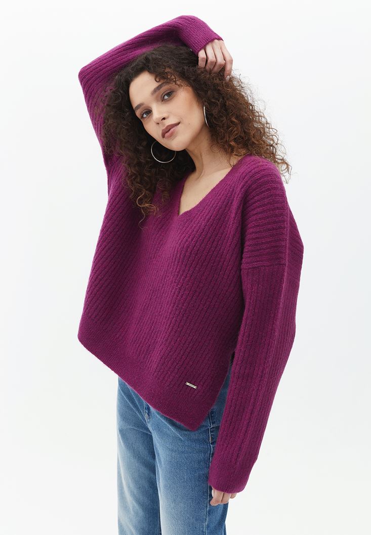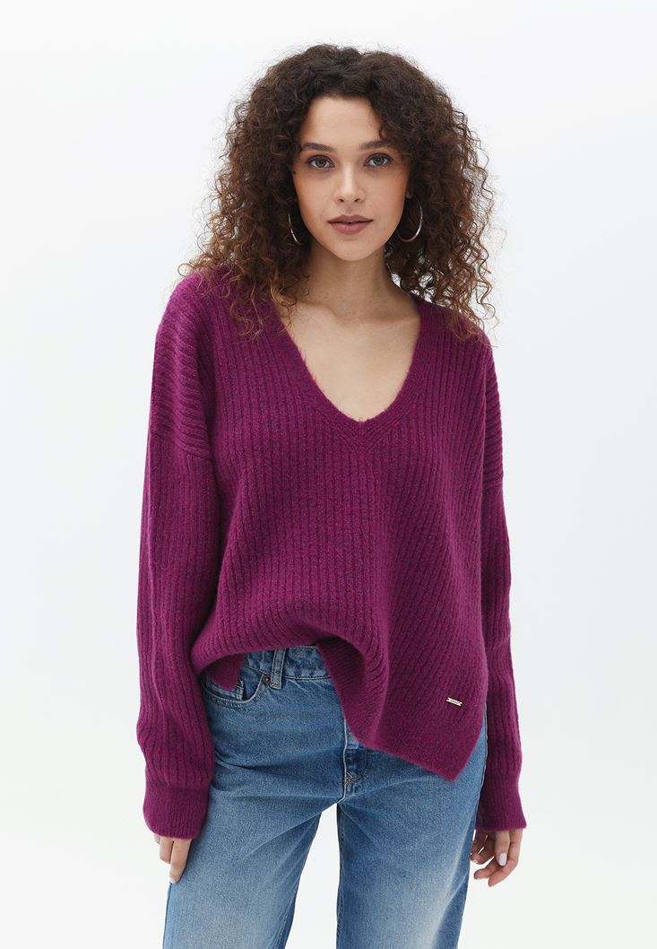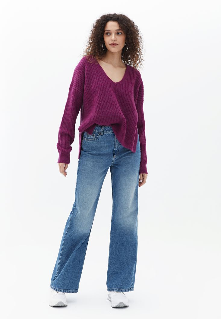 V Yaka Kazak ve Yüksek Bel Pantolon Kombini