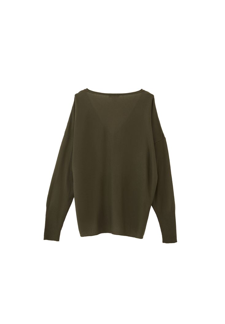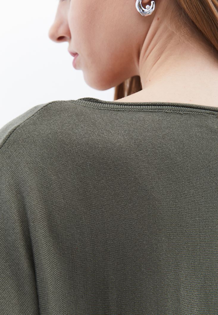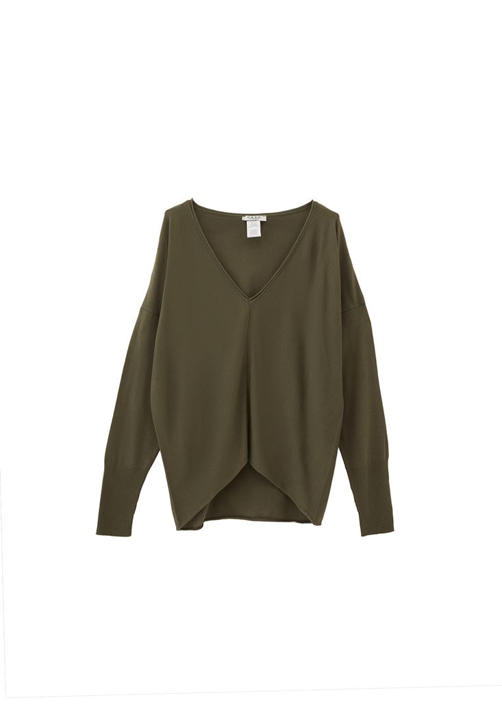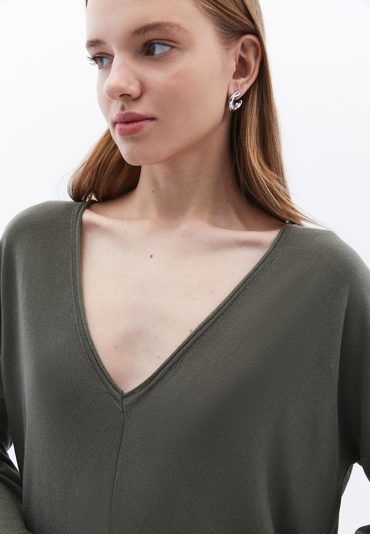 Pamuk karışımlı triko, bedenden uzak loose fit, uzun kollu, V yaka, önü kısa arkası uzun asimetrik kalıp.
