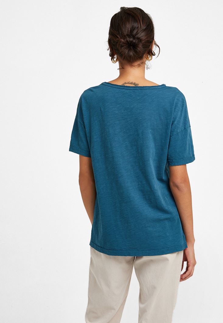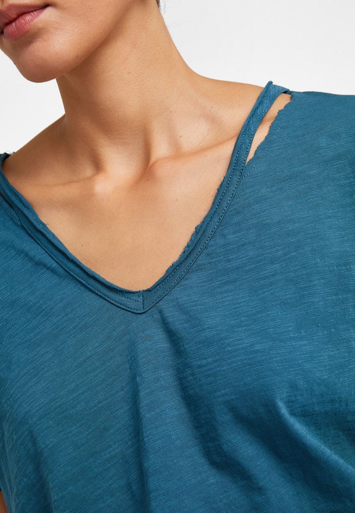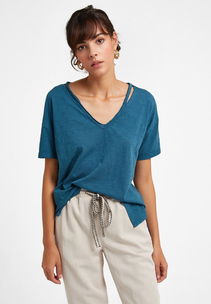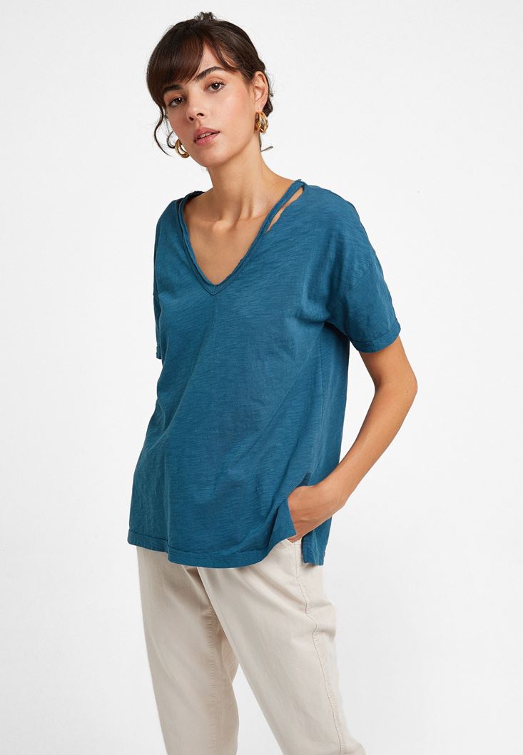 • Bayan Mavi V Yaka Kesik Detaylı Tişört