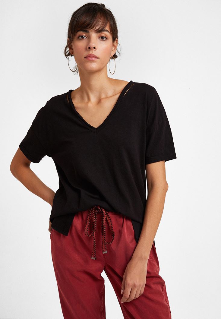 • Bayan Siyah V Yaka Kesik Detaylı Tişört