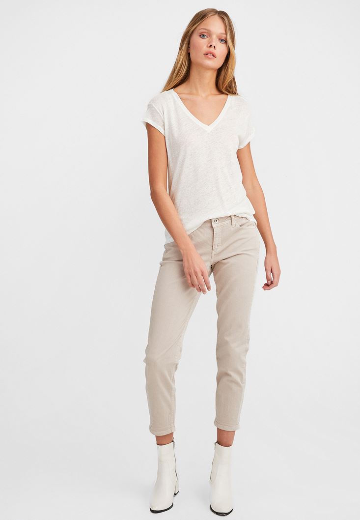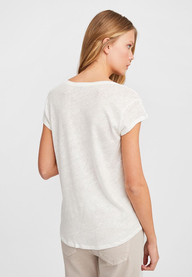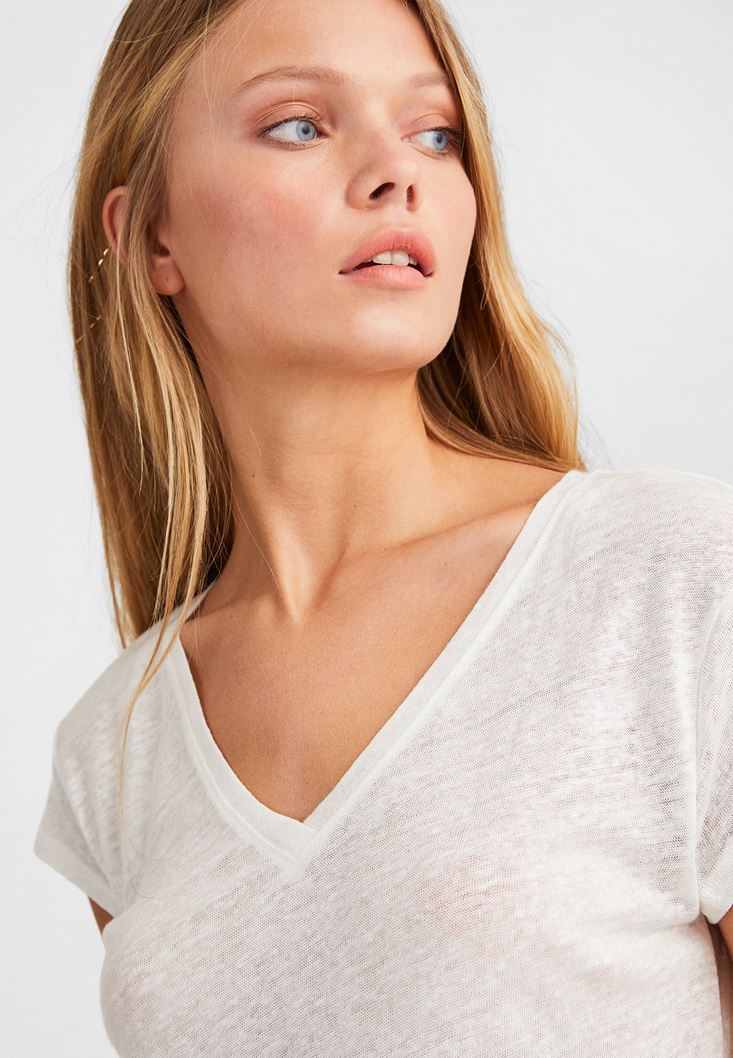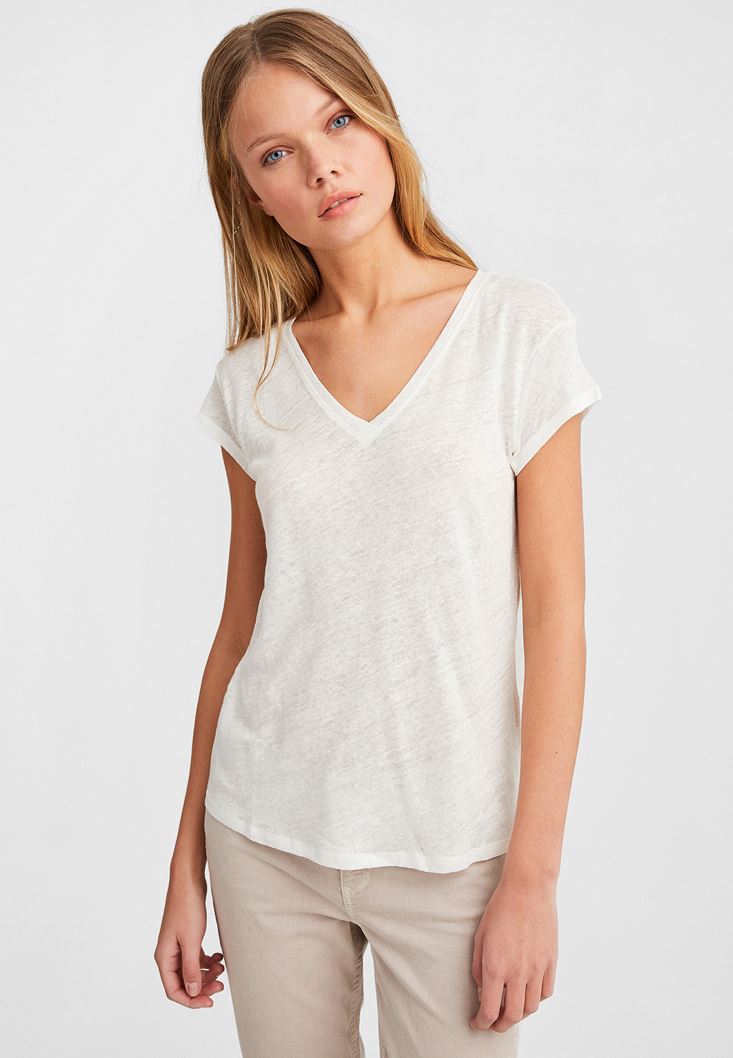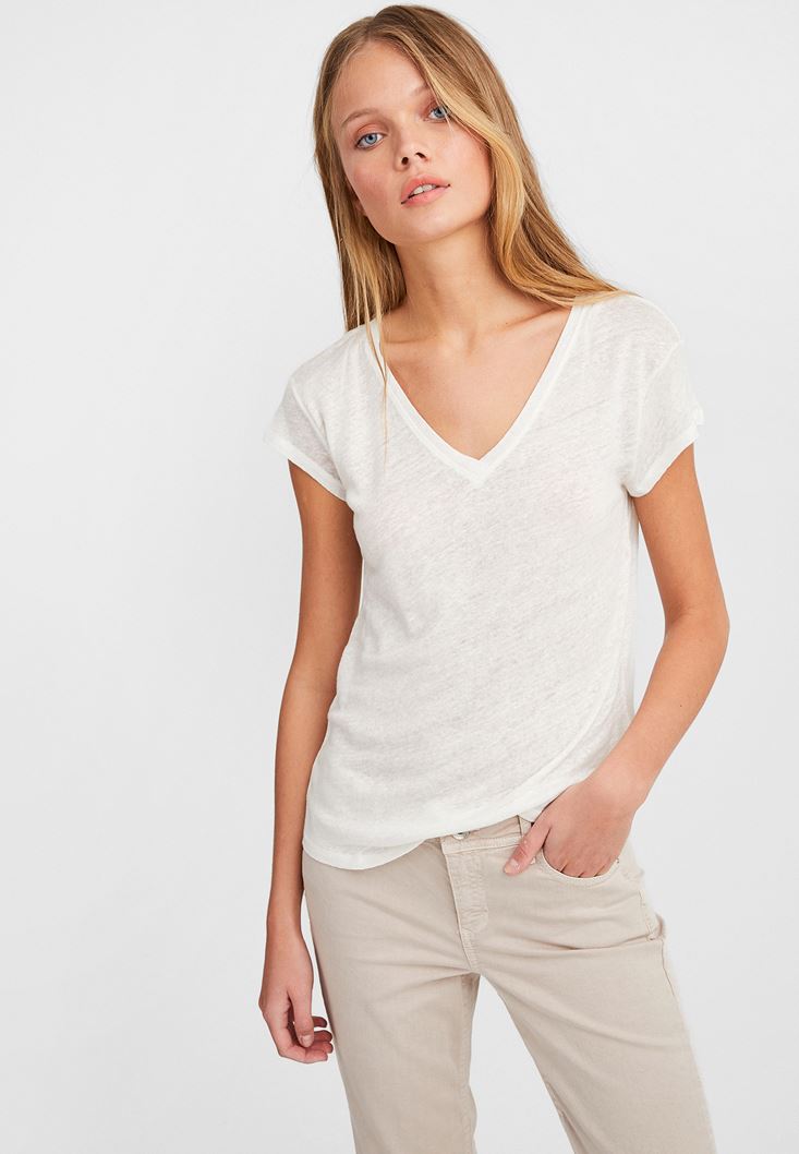 Krem V Yaka Keten Tişört
