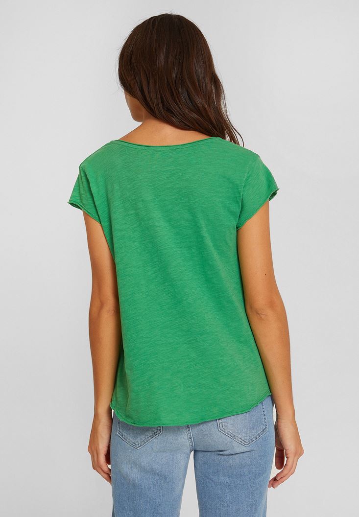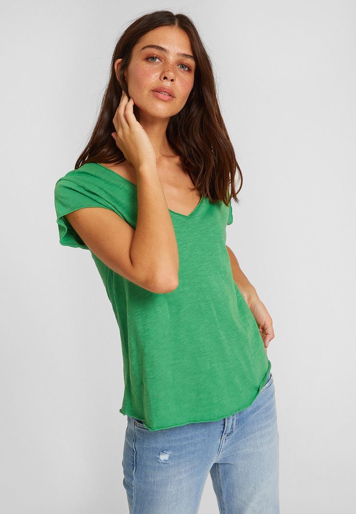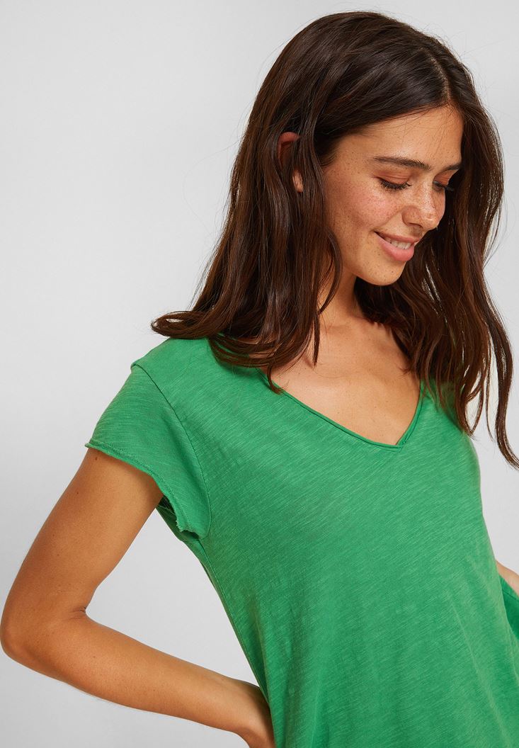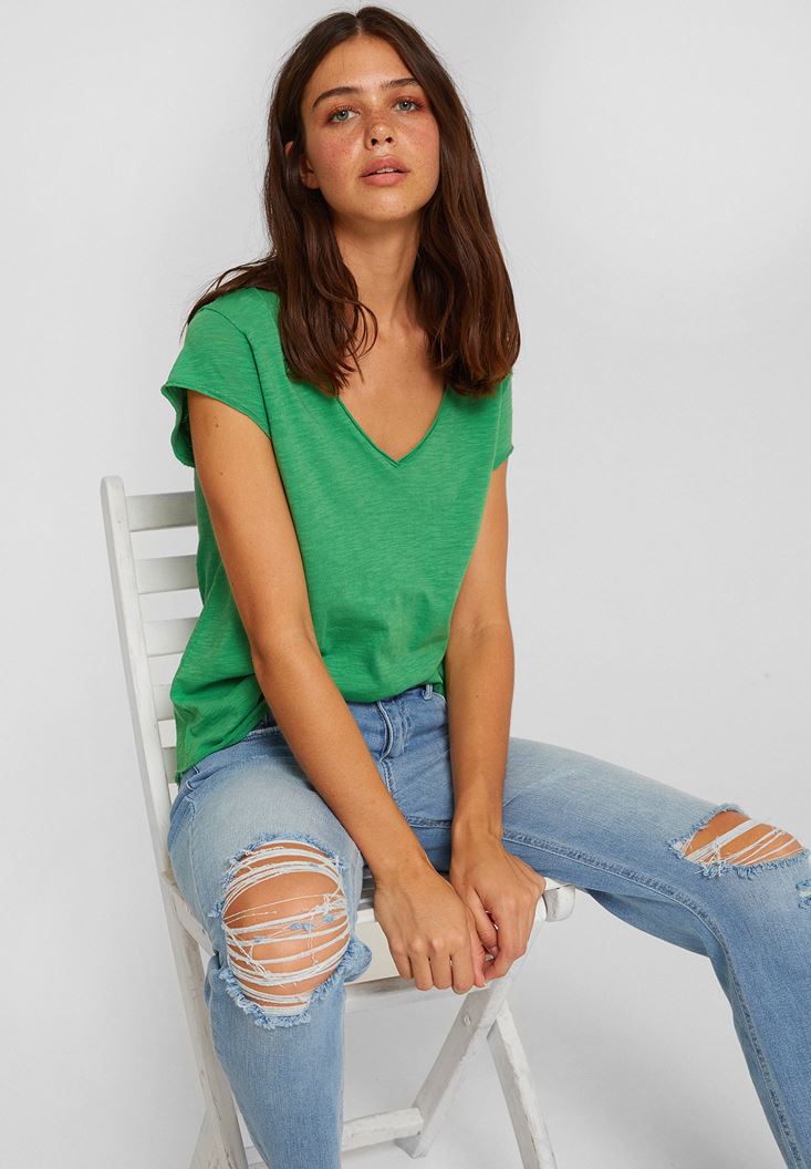 Yeşil V Yaka Kısa Kollu Pamuk Tişört