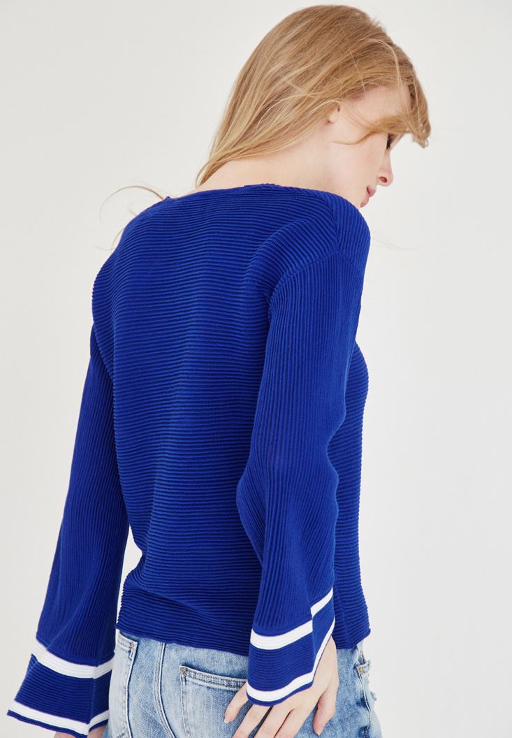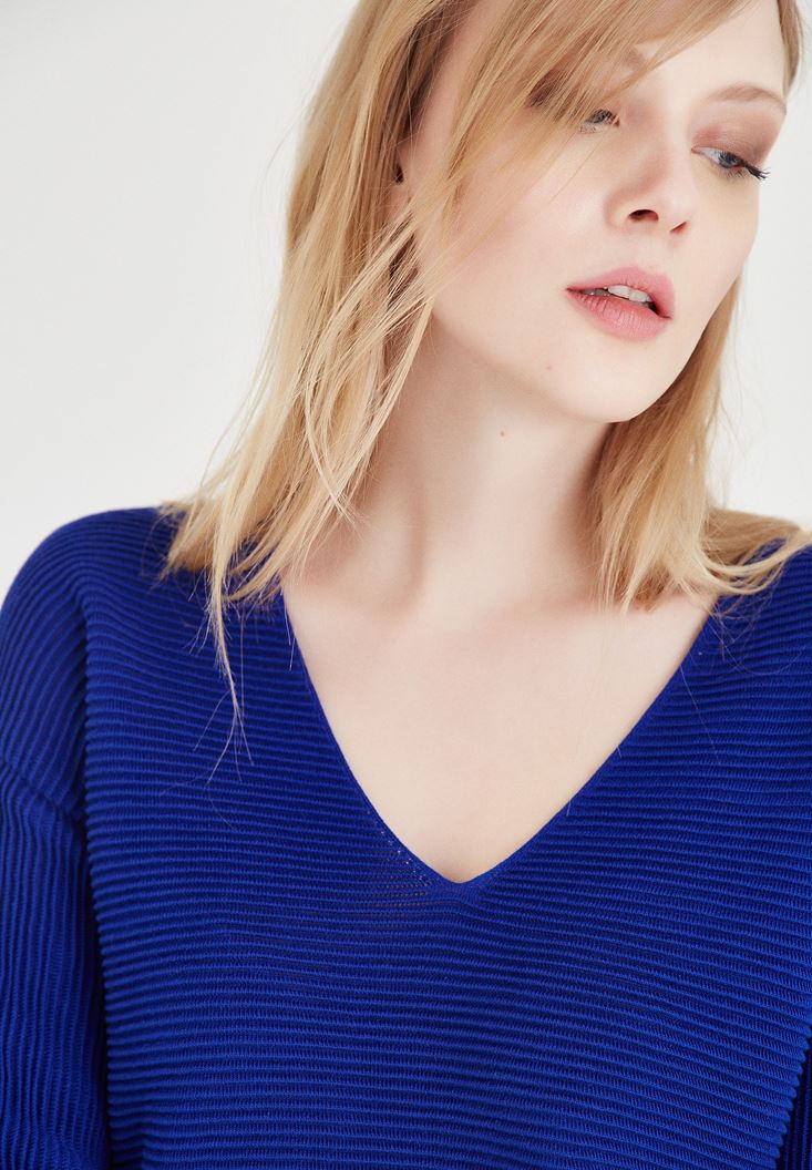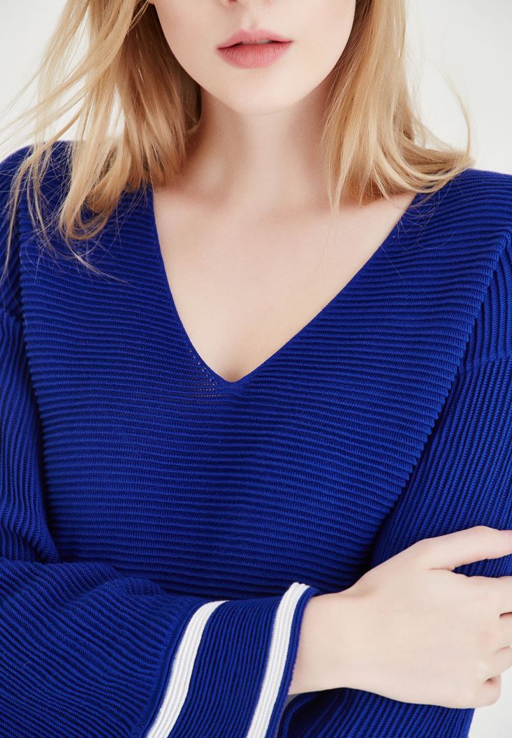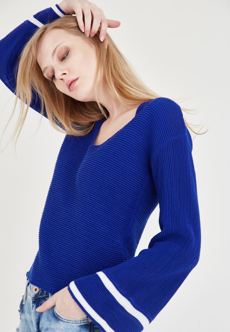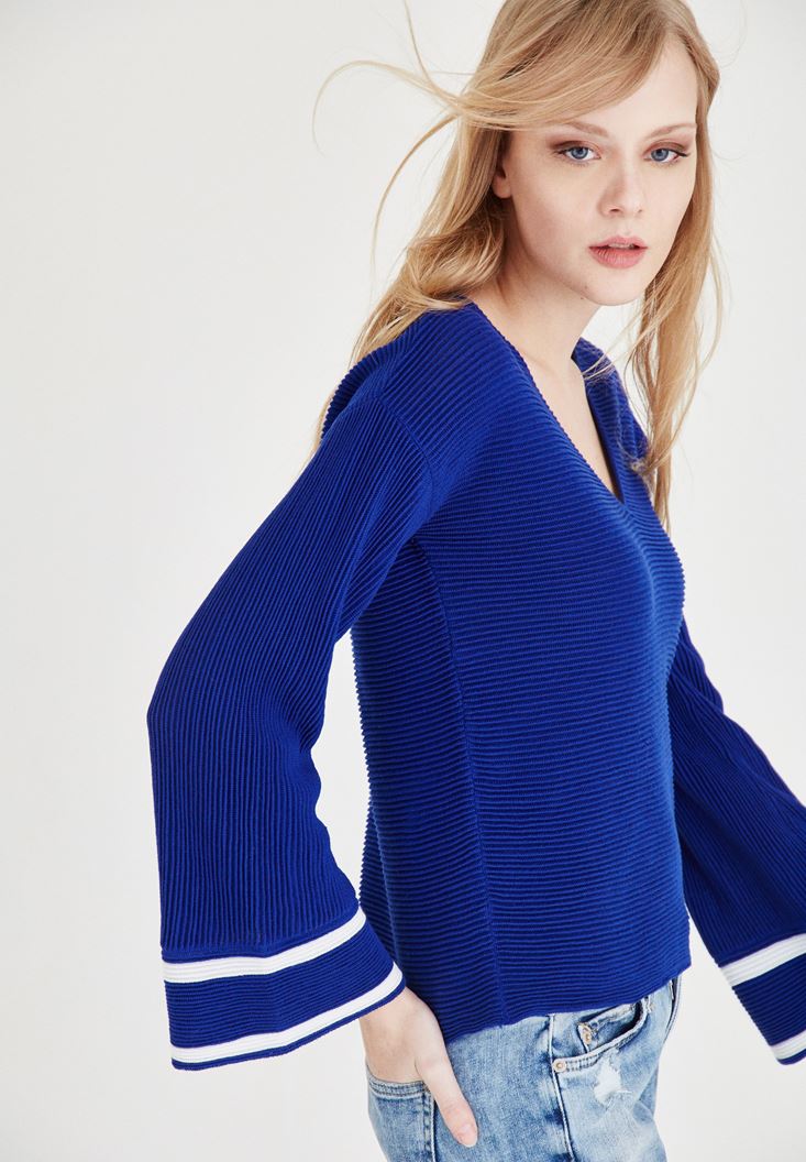 • Bayan Mavi V Yaka Kol Detaylı Kazak