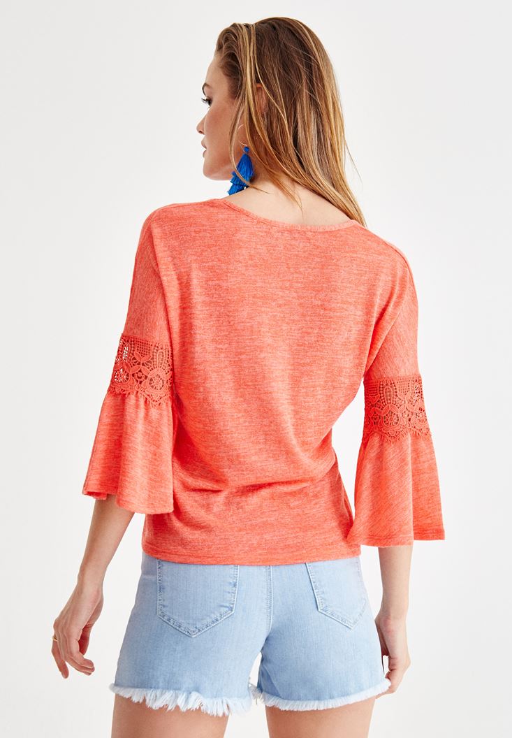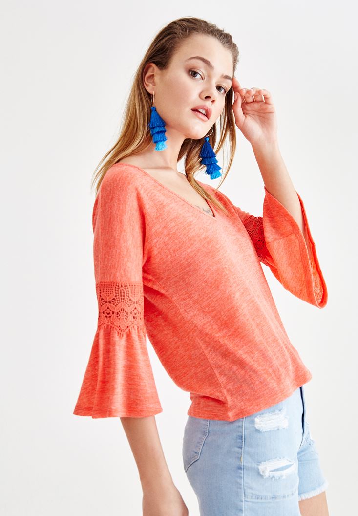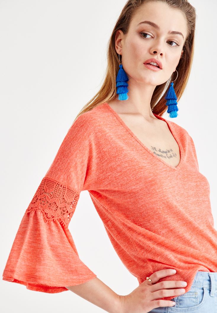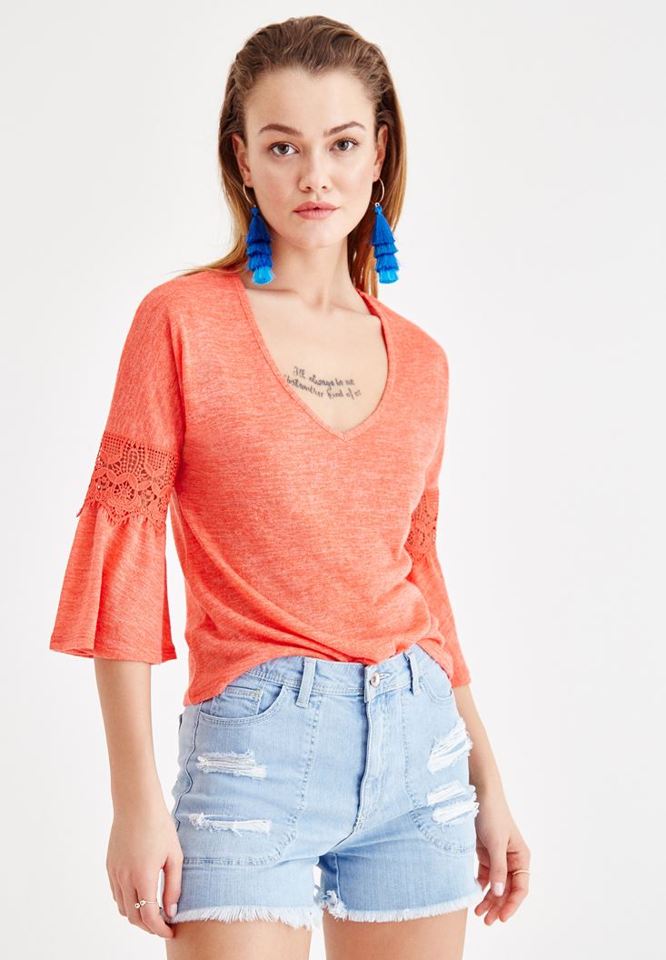 Kırmızı V Yaka Kolları Dantel Detaylı Bluz