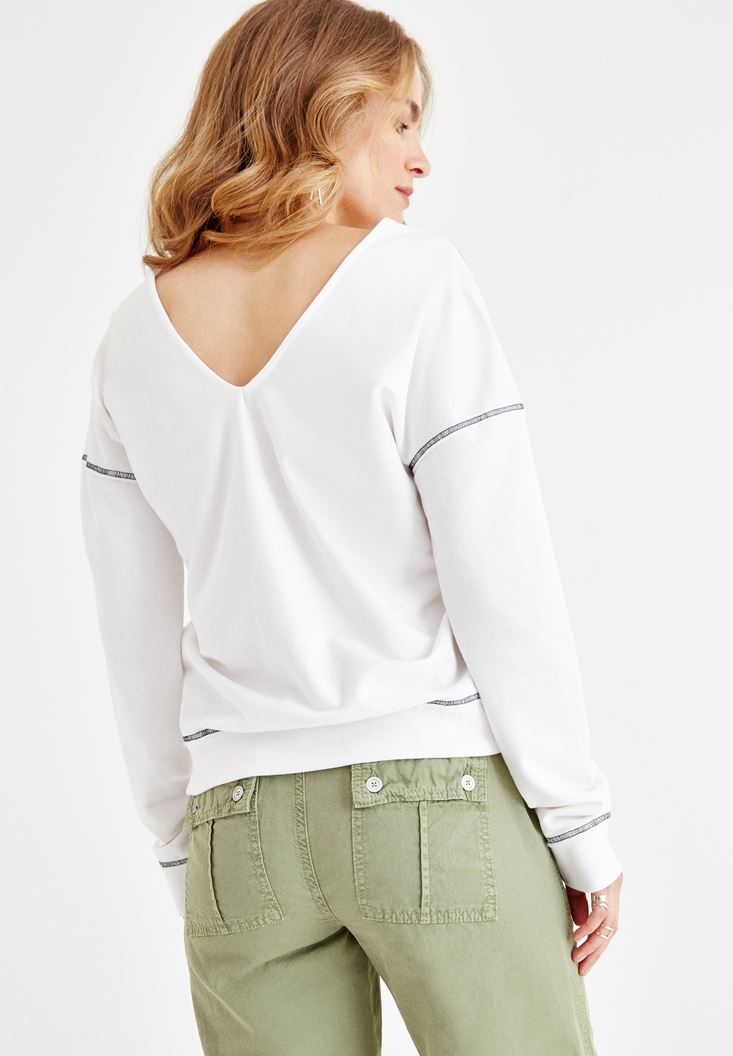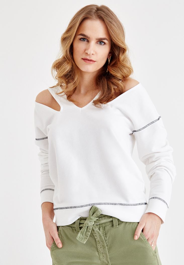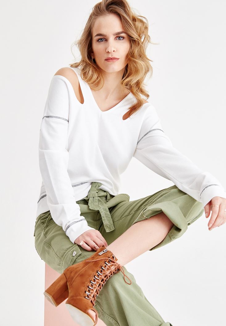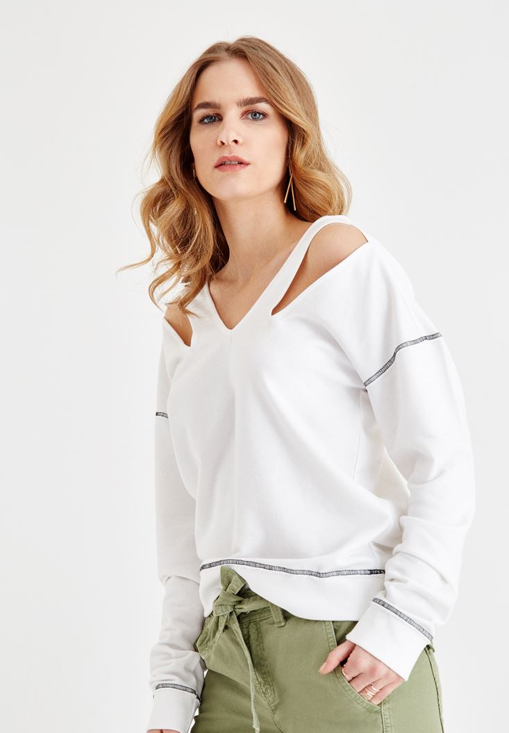 Krem V Yaka Omuz Detaylı Sweatshirt