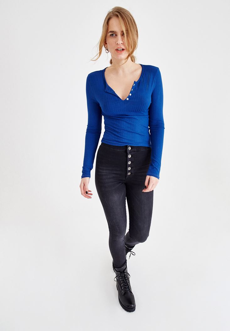 • Bayan Lacivert V Yaka Önü Düğmeli Tişört