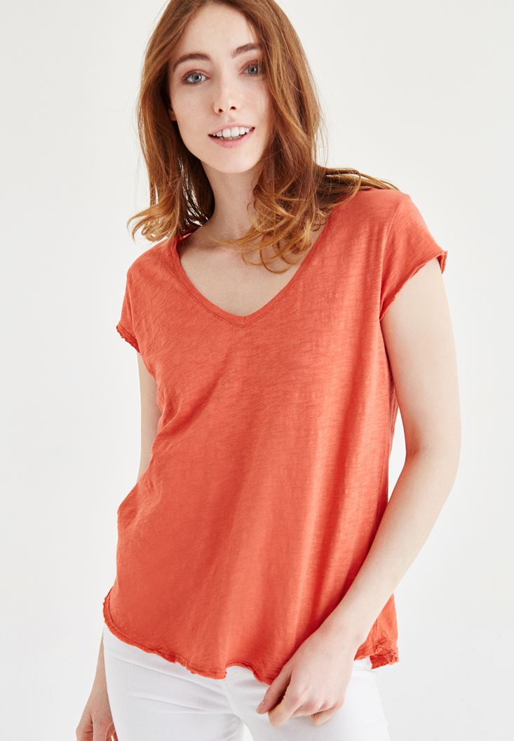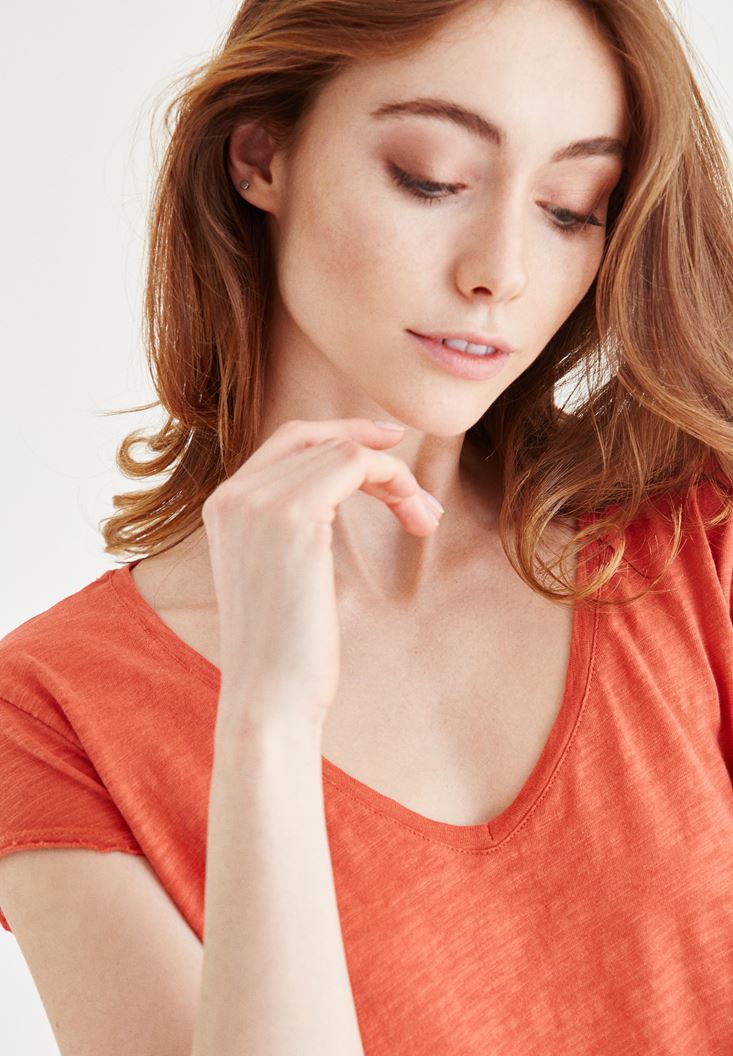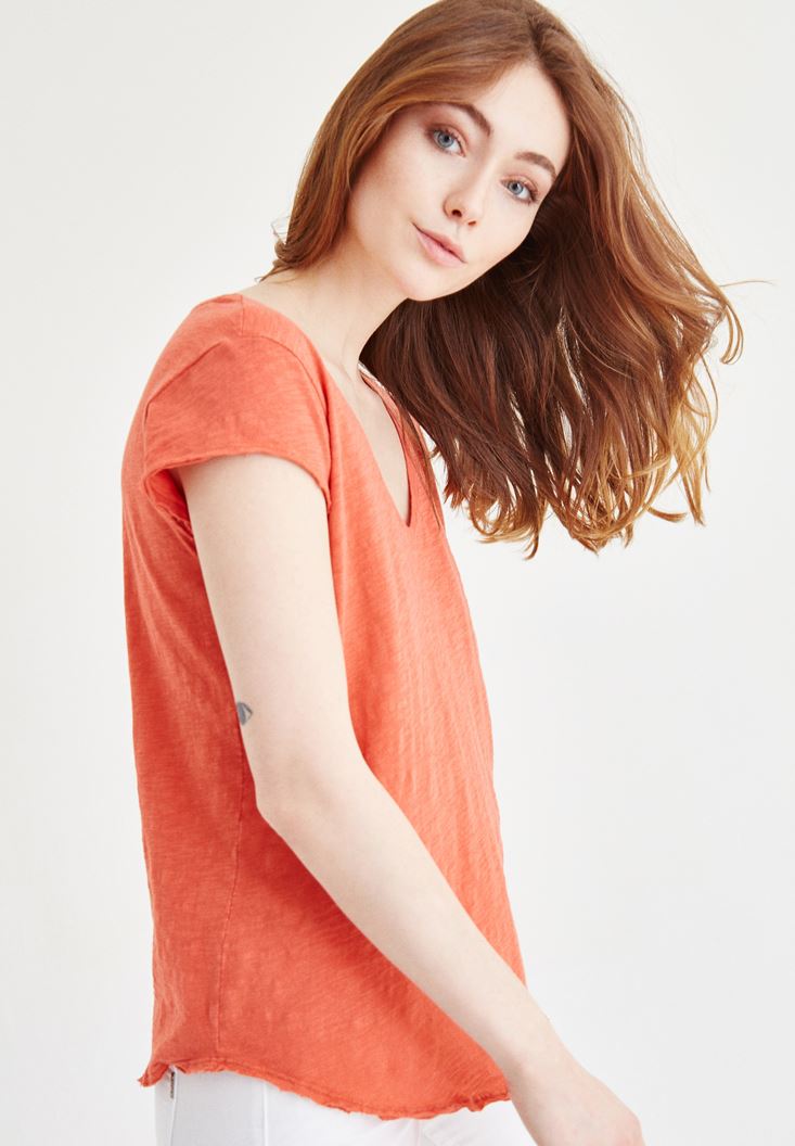 Turuncu V Yaka Pamuklu Tişört