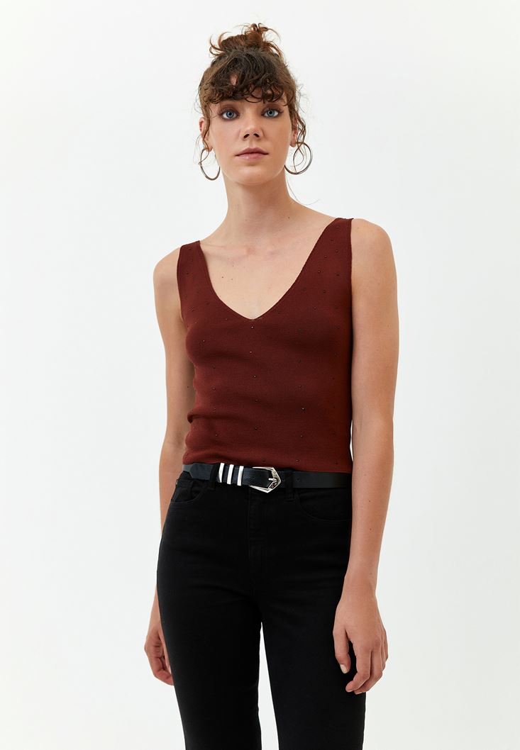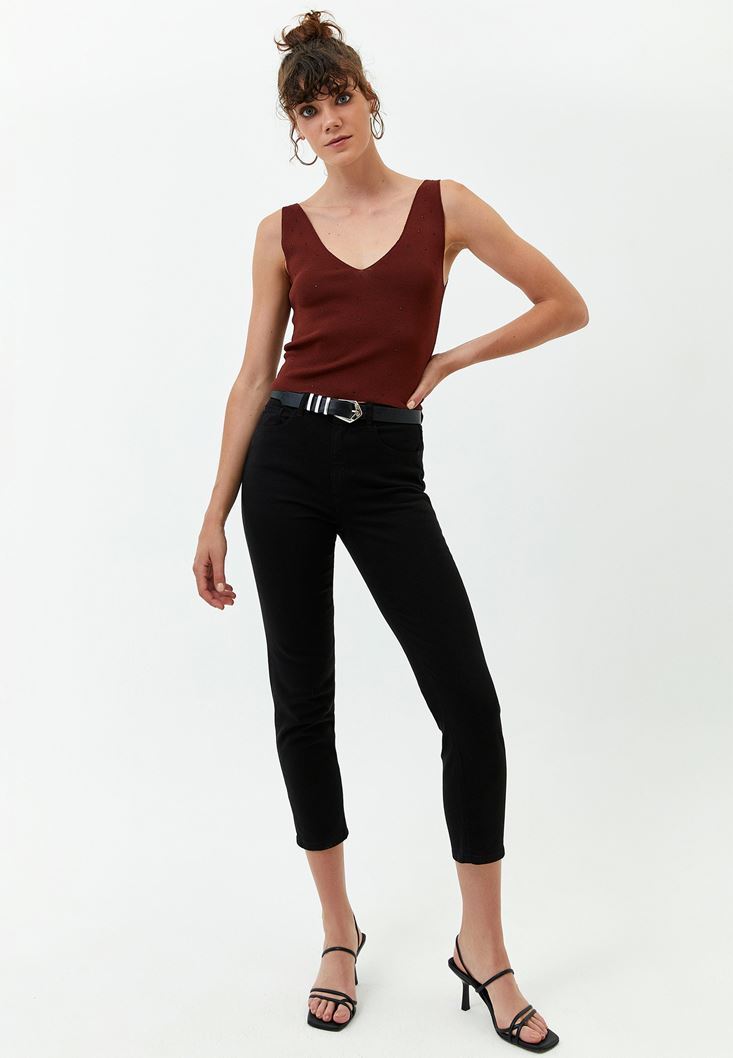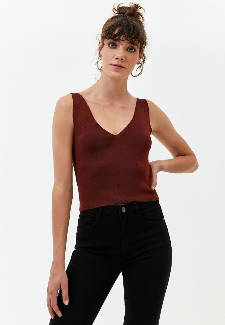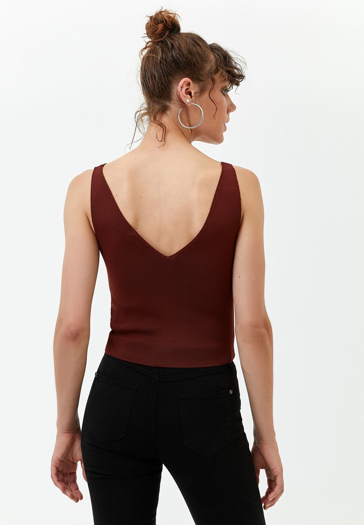 Viskon karışımlı doku, kalın askılı, V yaka, bedeni saran rahat kalıp, arka kısmı V kesim, crop boy, triko doku.