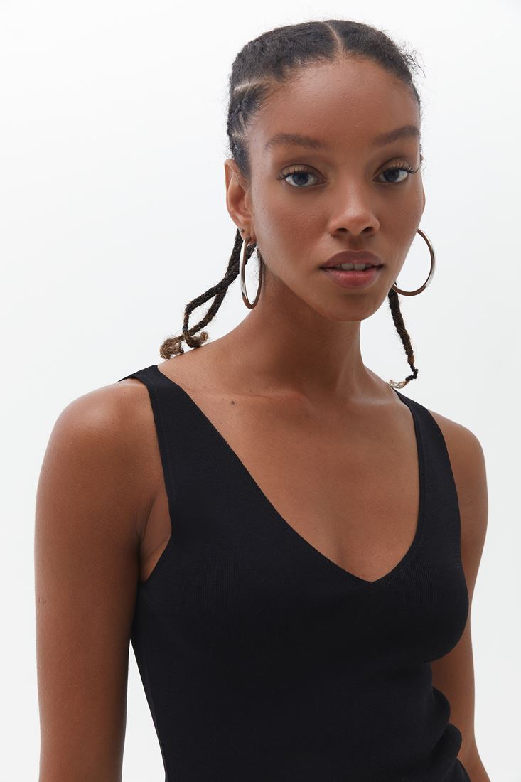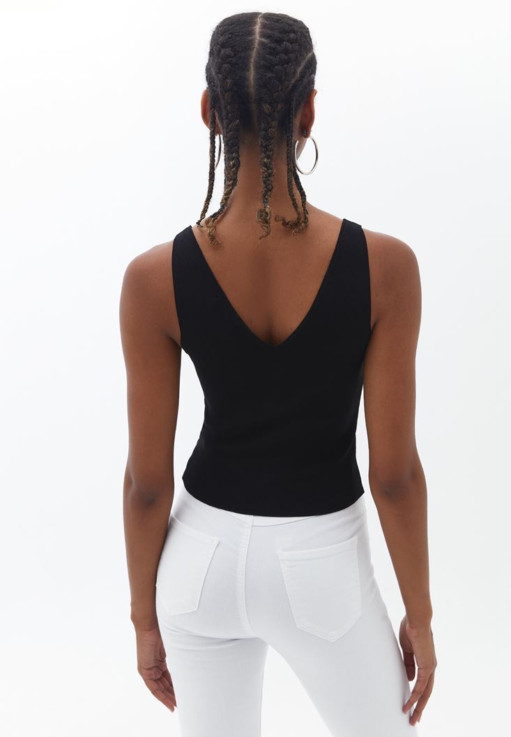 Viskon içerikli örgü triko, V yaka, kalın askılı, bedeni saran esnek fit, sırt kısmı V kesim, crop boy.