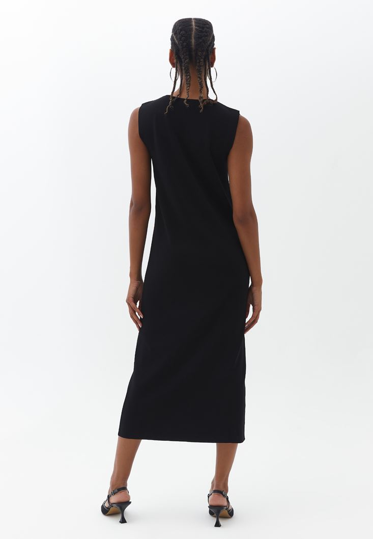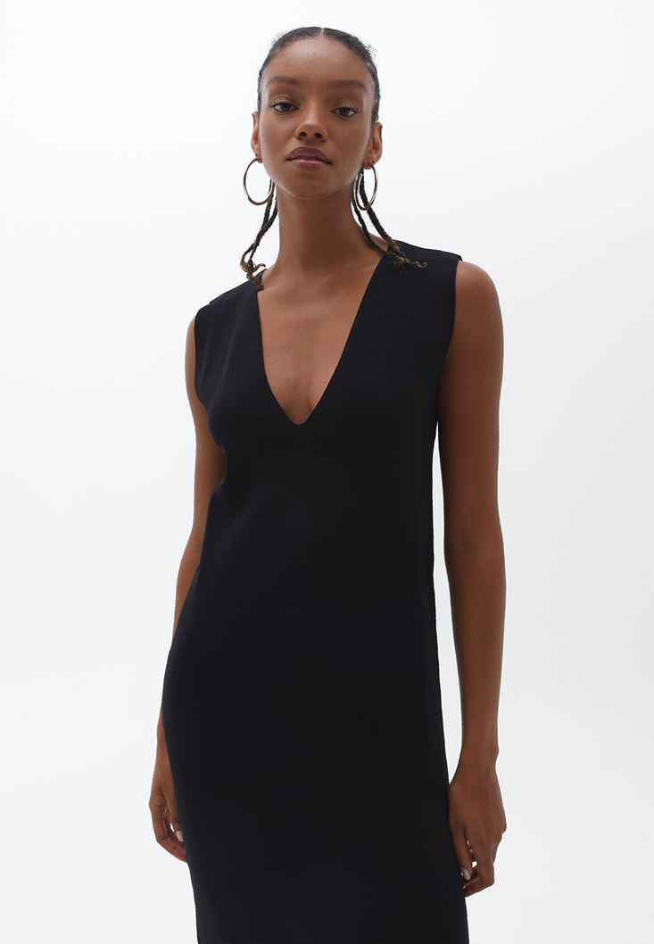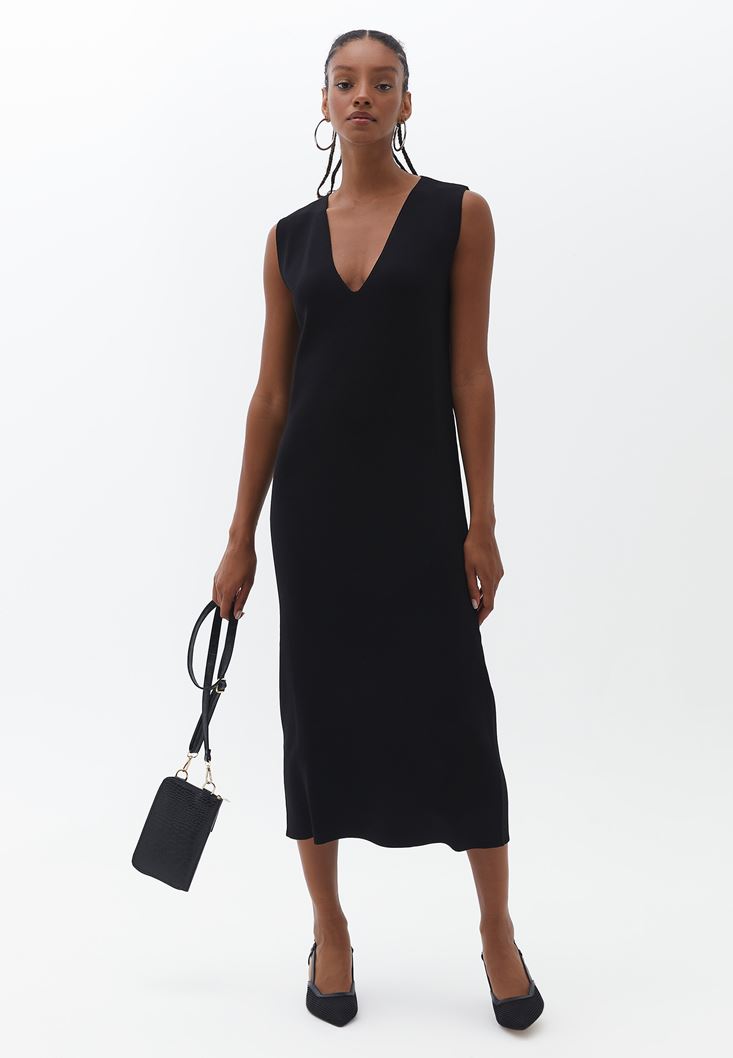 Viskon karışımlı triko, V yaka, bedenden uzak rahat fit, midi boy.