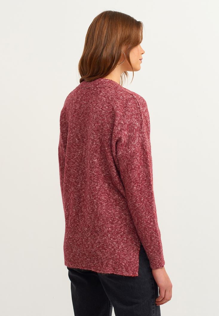 Pamuk karışımlı içerik, yaka/kol ve etek ucu jakarlı örgü, V yaka, bedenden uzak rahat fit, iki yanı yırtmaçlı, uzun kollu, standart boy.