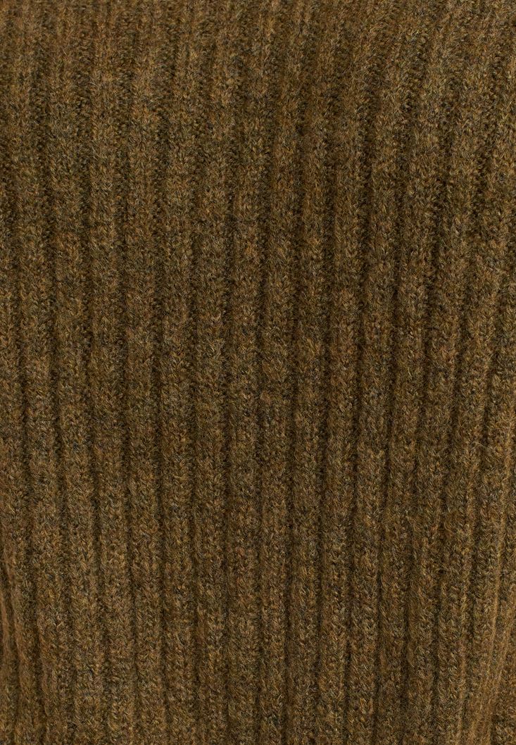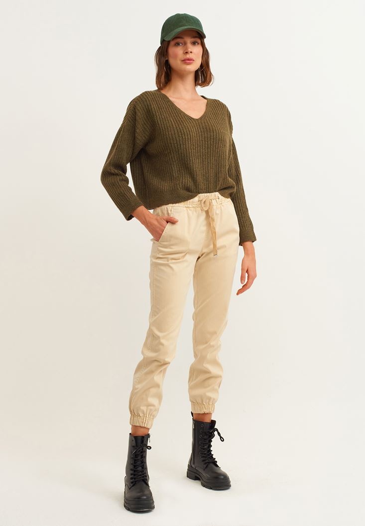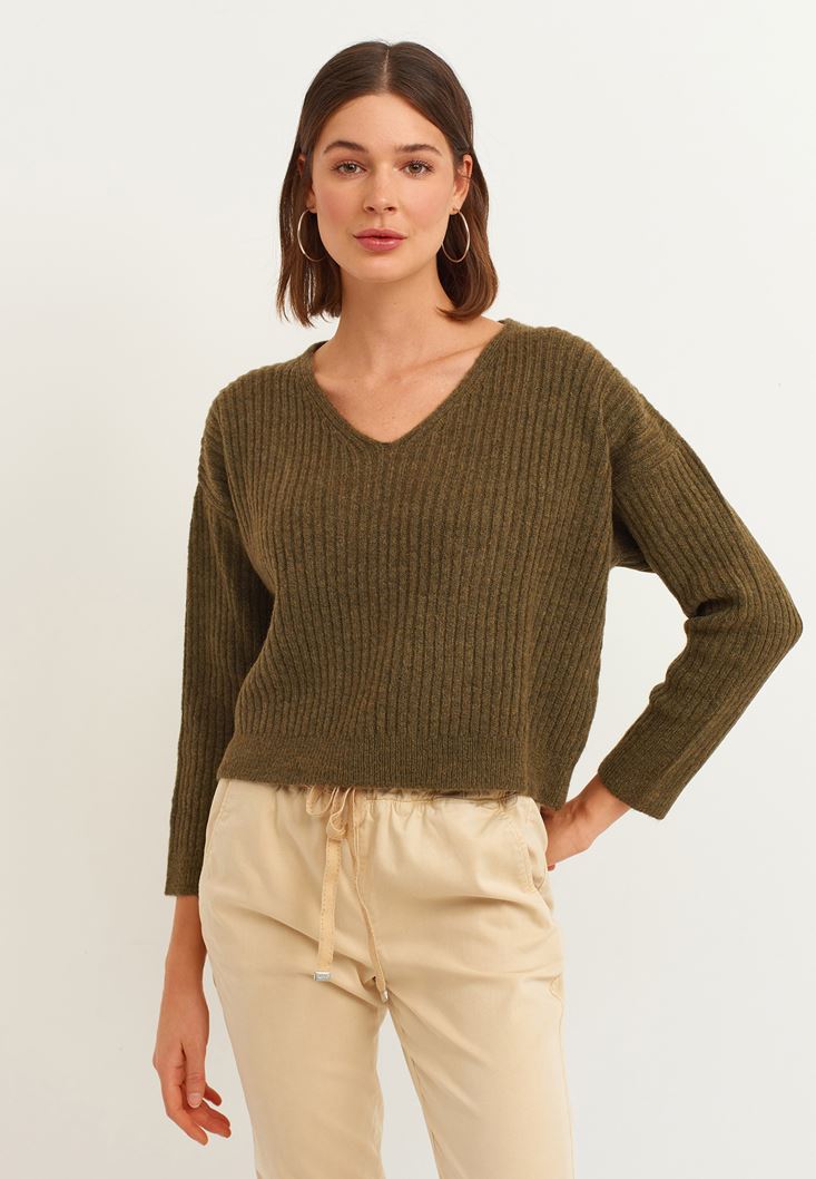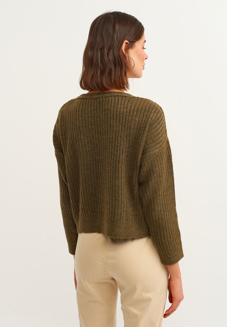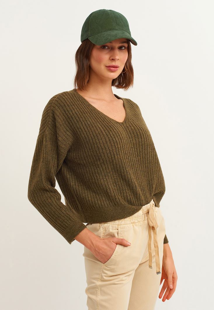 Fitilli triko doku, V yaka, bedenden uzak rahat kalıp, standart boy, uzun kollu.