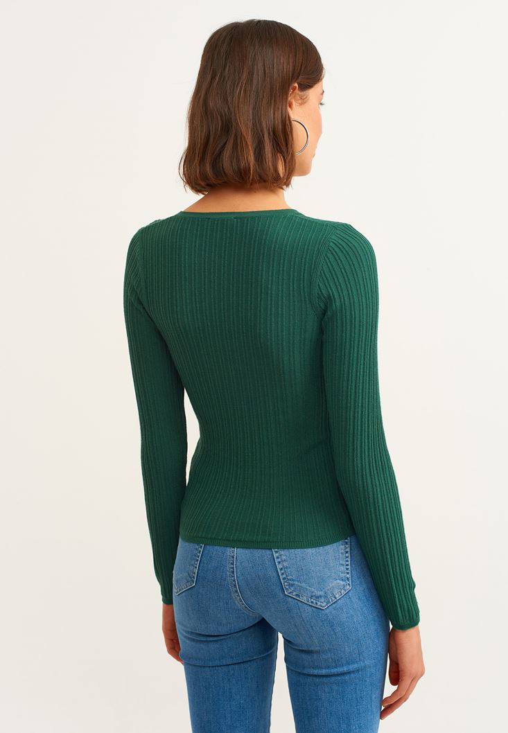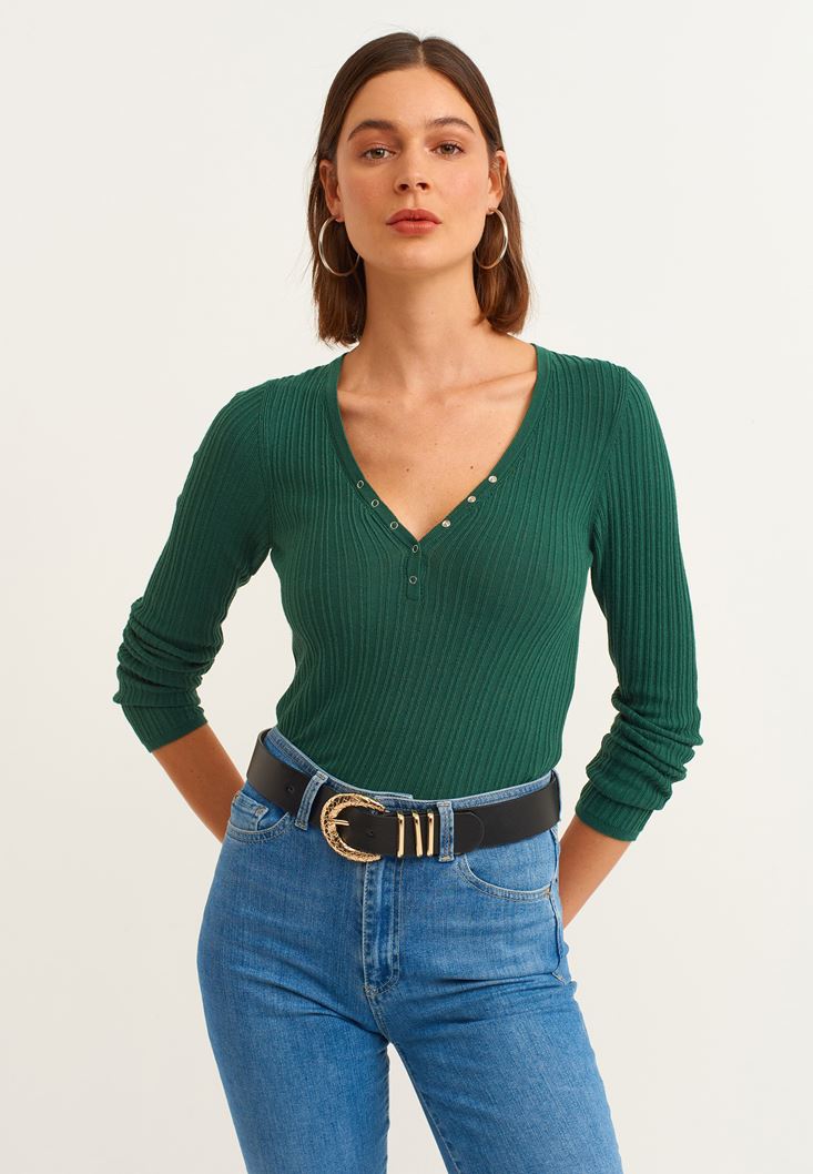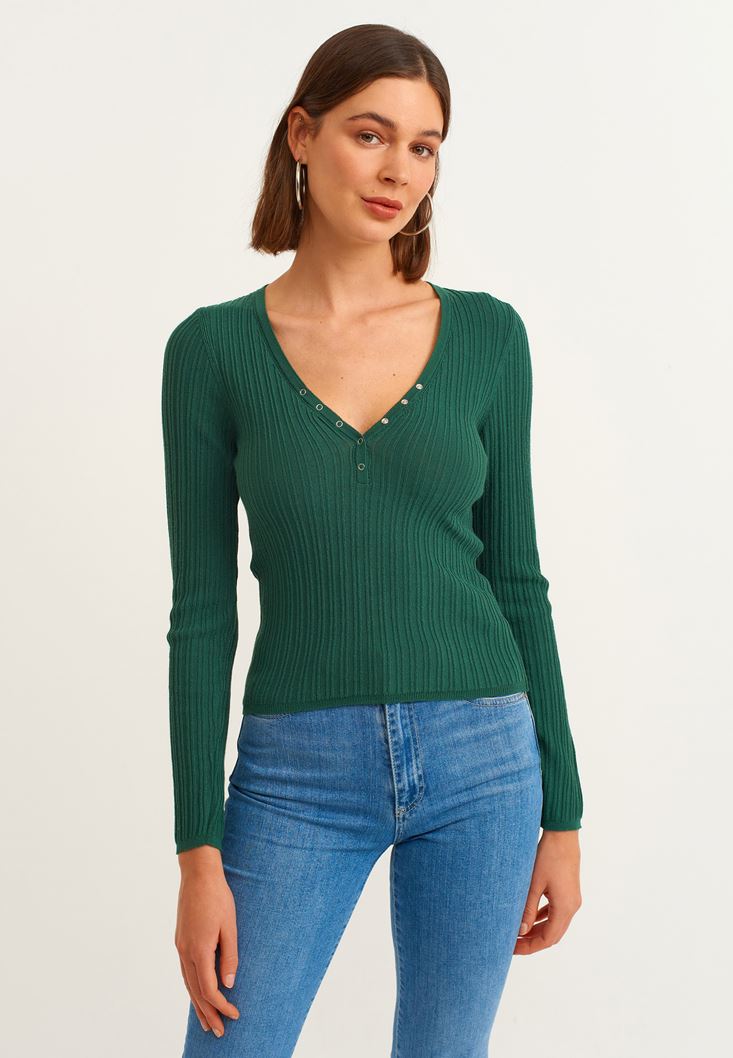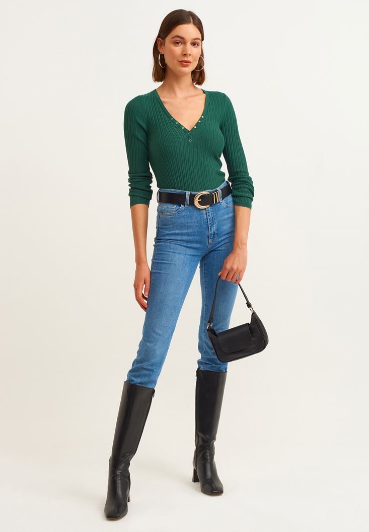 Yeşil V Yaka Triko Kazak