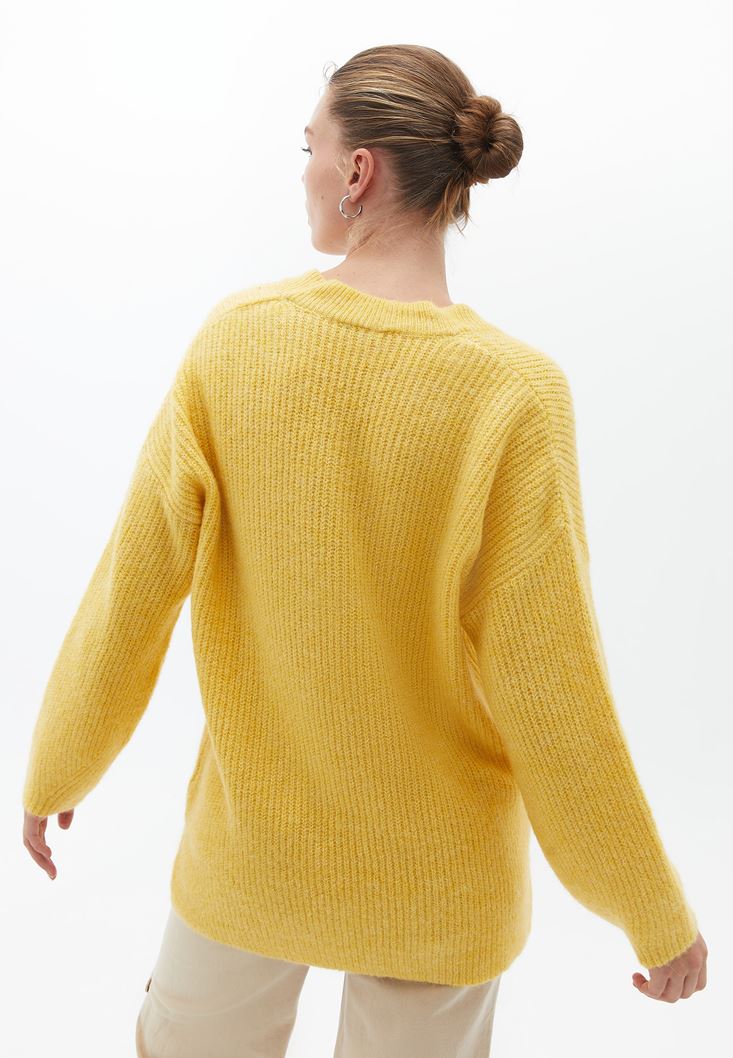 Viskon karışımlı triko, V yaka, bedenden uzak loose fit, uzun kollu, önü kısa arkası uzun asimetrik tasarım, fitilli örgü.