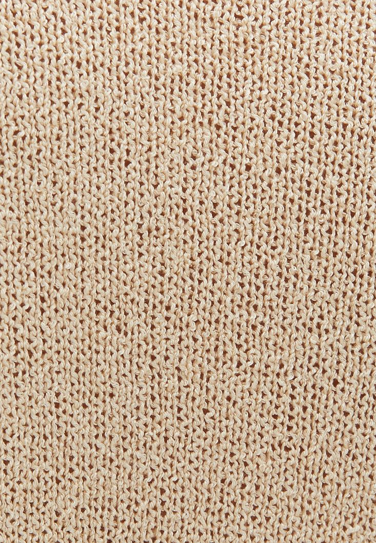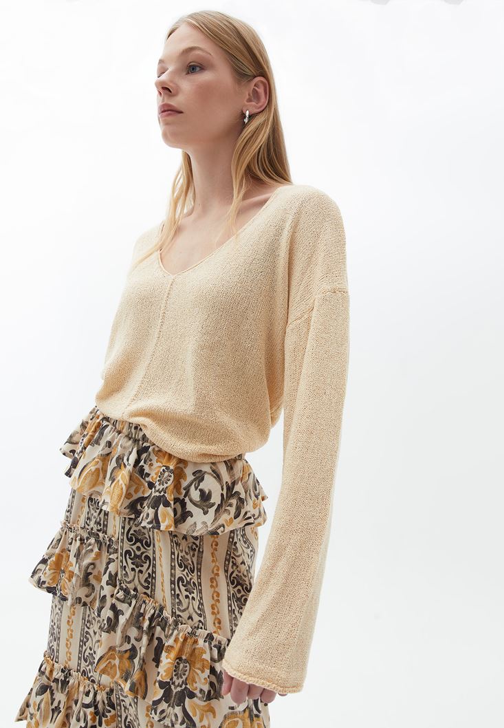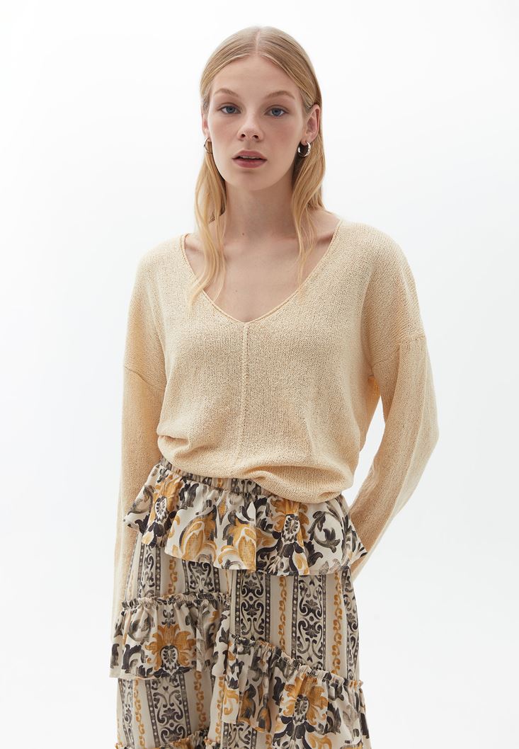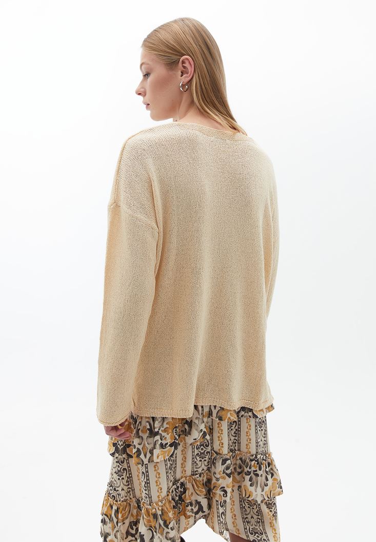 Yumuşak özel triko doku, V yaka, ön kısmı dikiş detaylı, bedenden uzak oversize kalıp, önü kısa arkası uzun asimetrik kesim, uzun kollu.