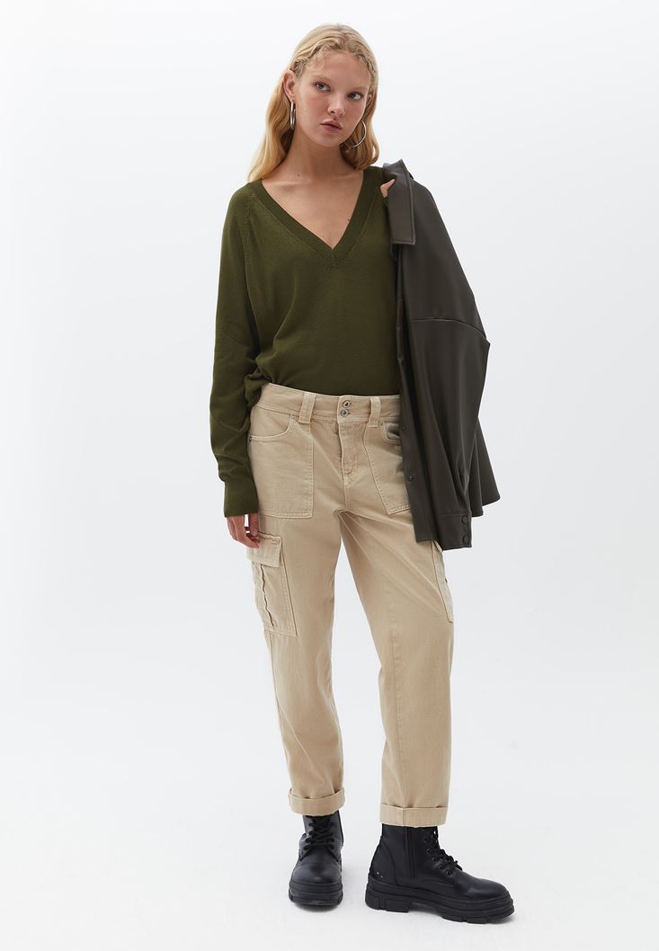 Viskon karışımlı triko, V yaka, uzun kollu, bedenden uzak fit, standart boy.