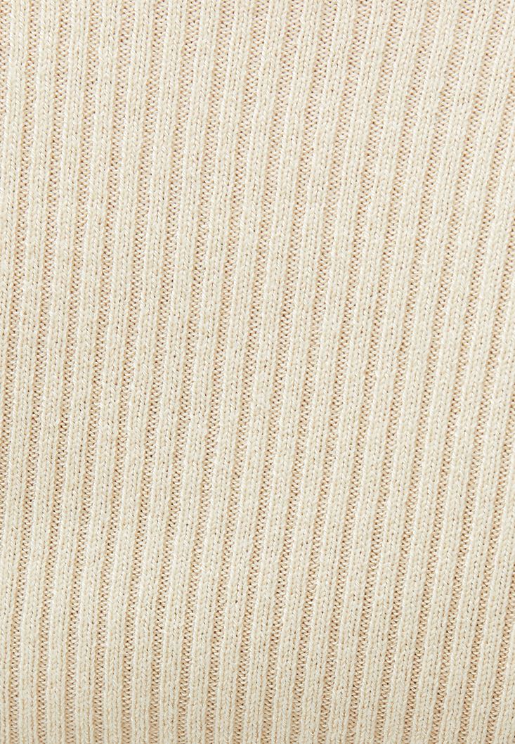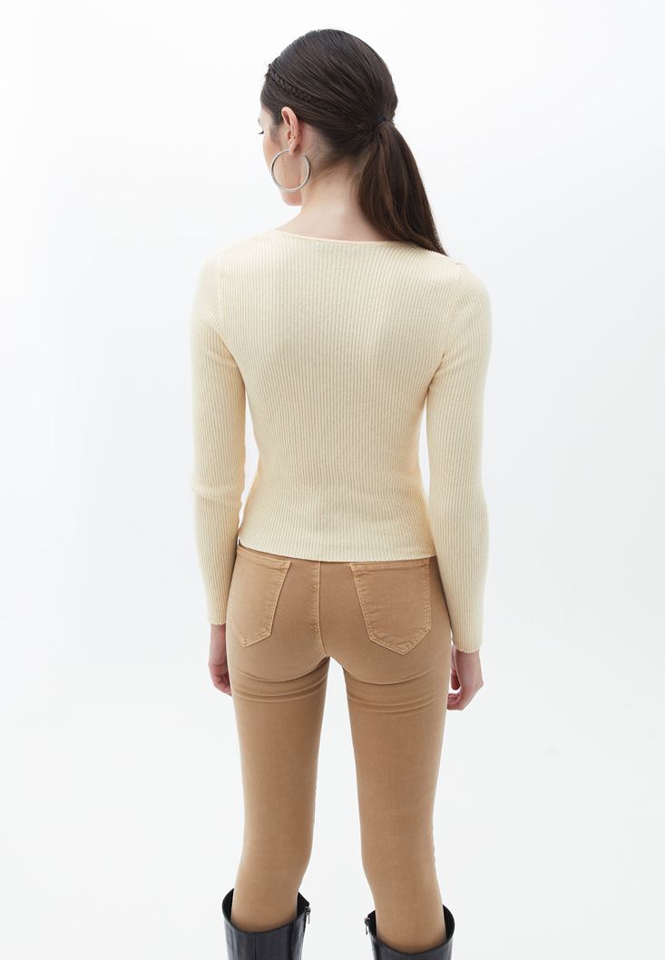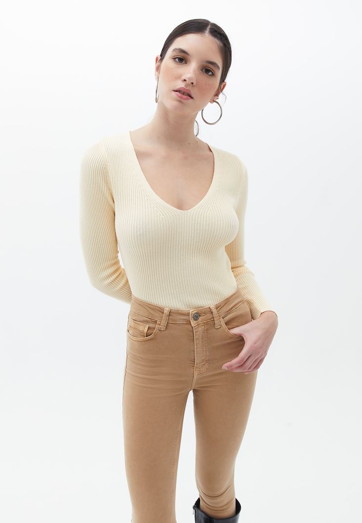 Viskon karışımlı triko, V yaka, fitilli örgü, uzun kollu, bedeni saran esnek fit, standart boy.
