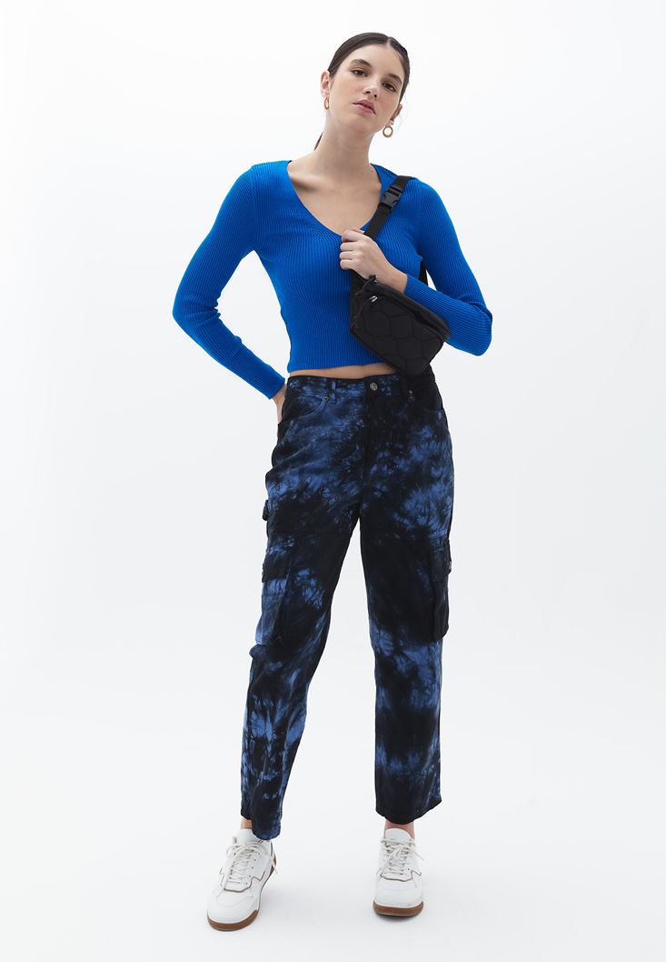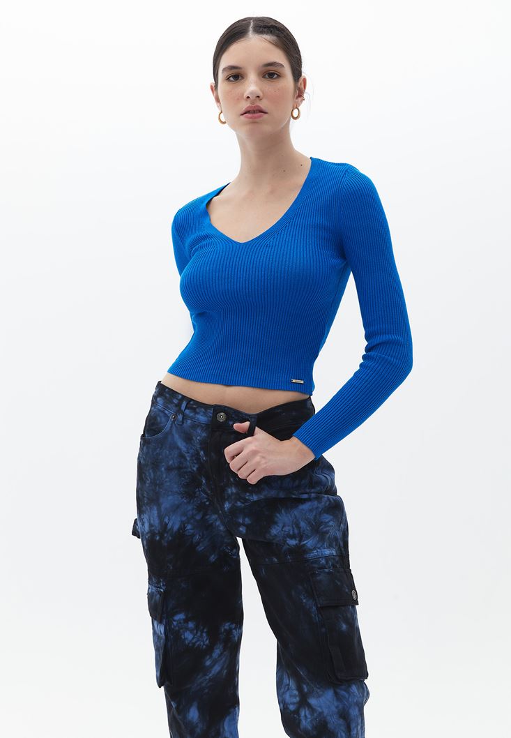 Viskon karışımlı triko, V yaka, fitilli örgü, uzun kollu, bedeni saran esnek fit, standart boy.