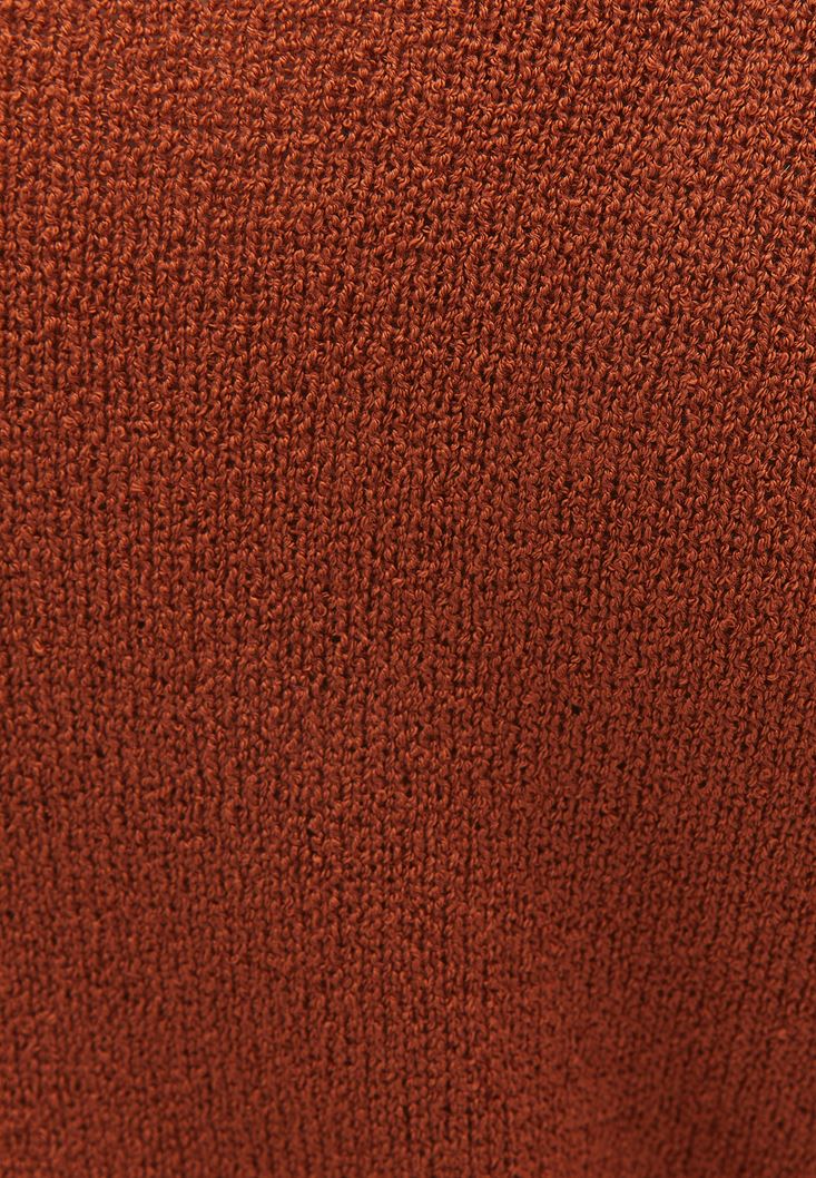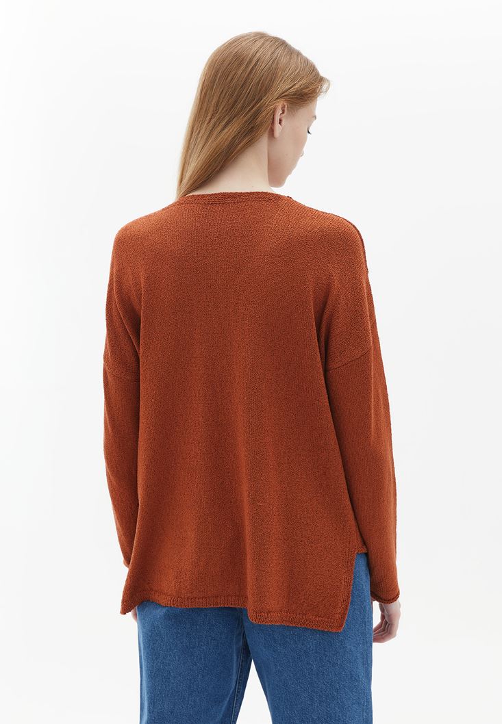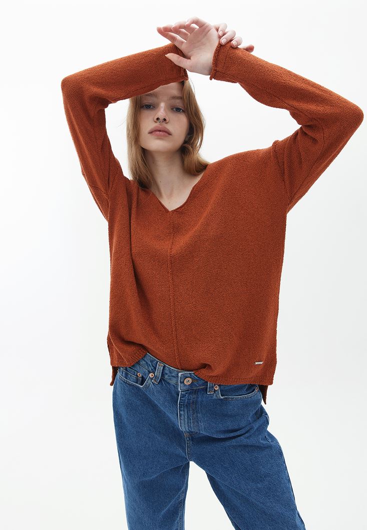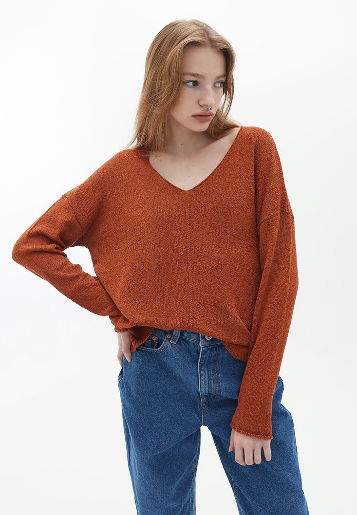 Yumuşak özel triko doku, V yaka, ön kısmı dikiş detaylı, bedenden uzak oversize kalıp, önü kısa arkası uzun asimetrik kesim, uzun kollu.