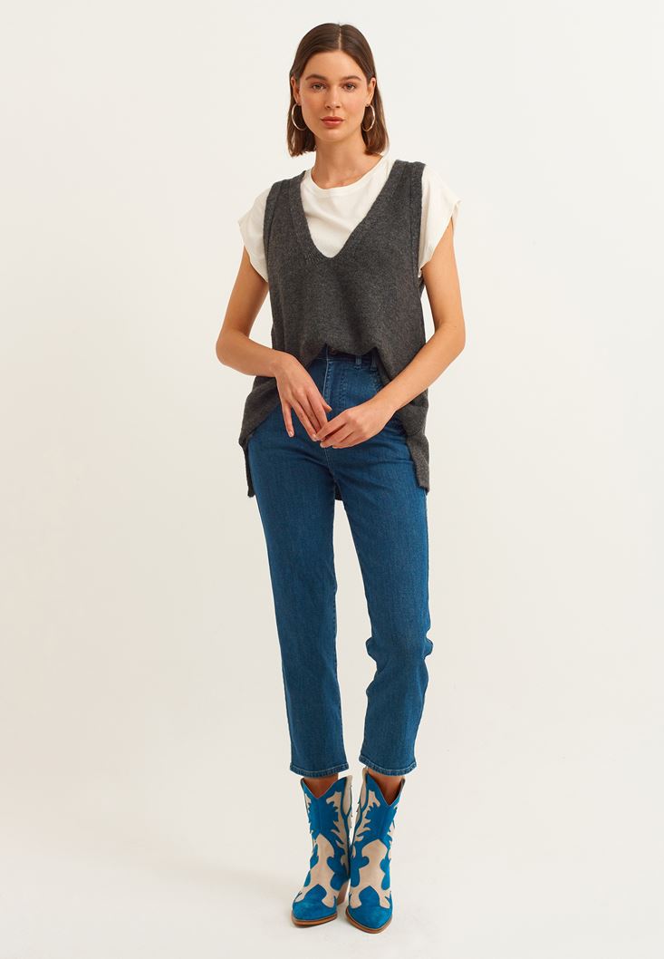Özel yumuşak triko, bedenden uzak rahat kalıp, derin V yaka, önü kısa arkası uzun asimetrik tasarım.
