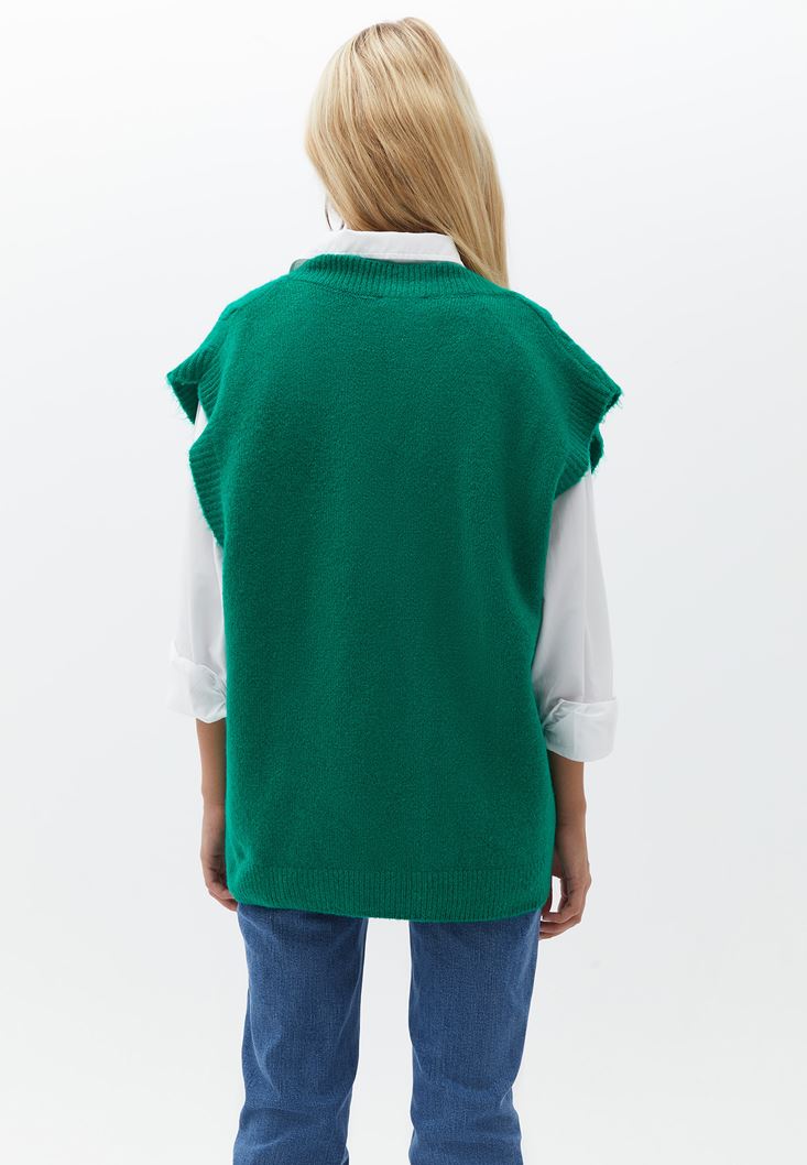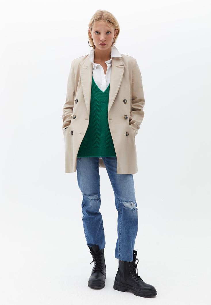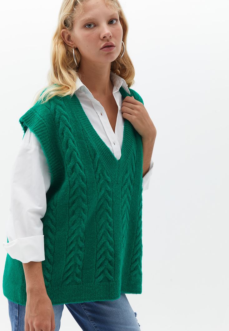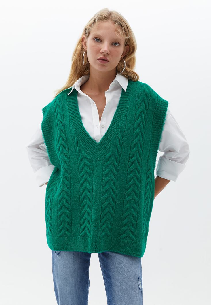 Özel triko örgü, derin V yaka, bedenden uzak relax fit, saç örgüsü motifli.
