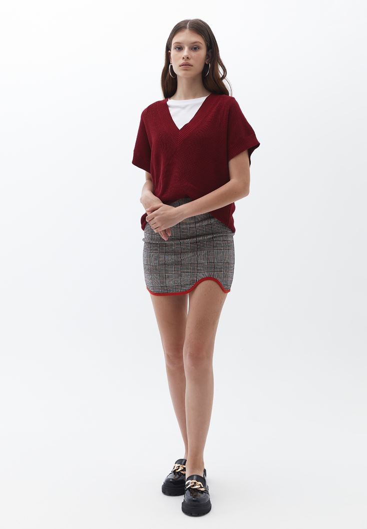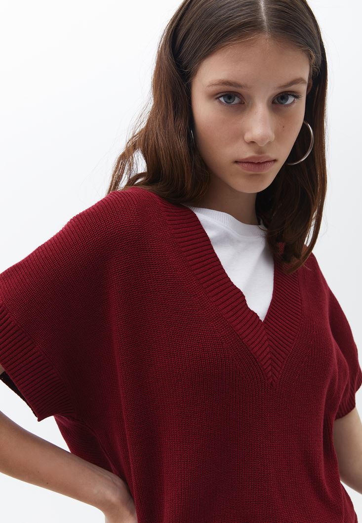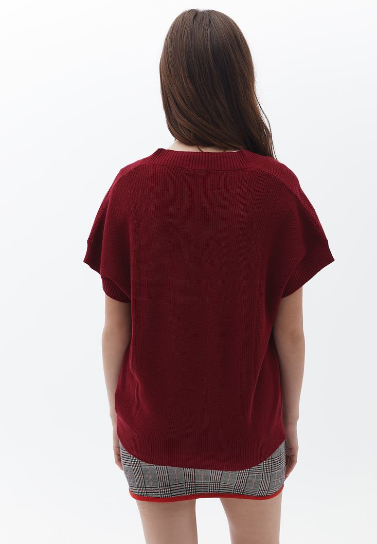 Pamuk karışımlı triko, V yaka, bedenden uzak oversize fit, yaka-kol ucu ve etek ucu jakarlı örgü.