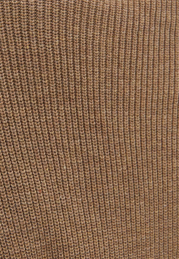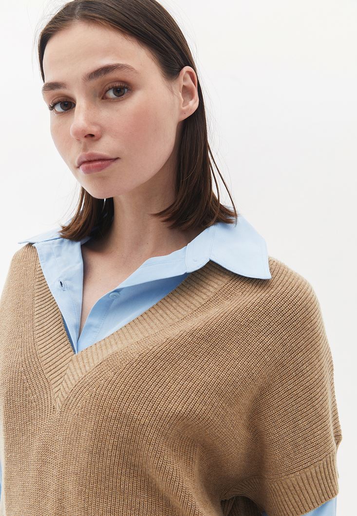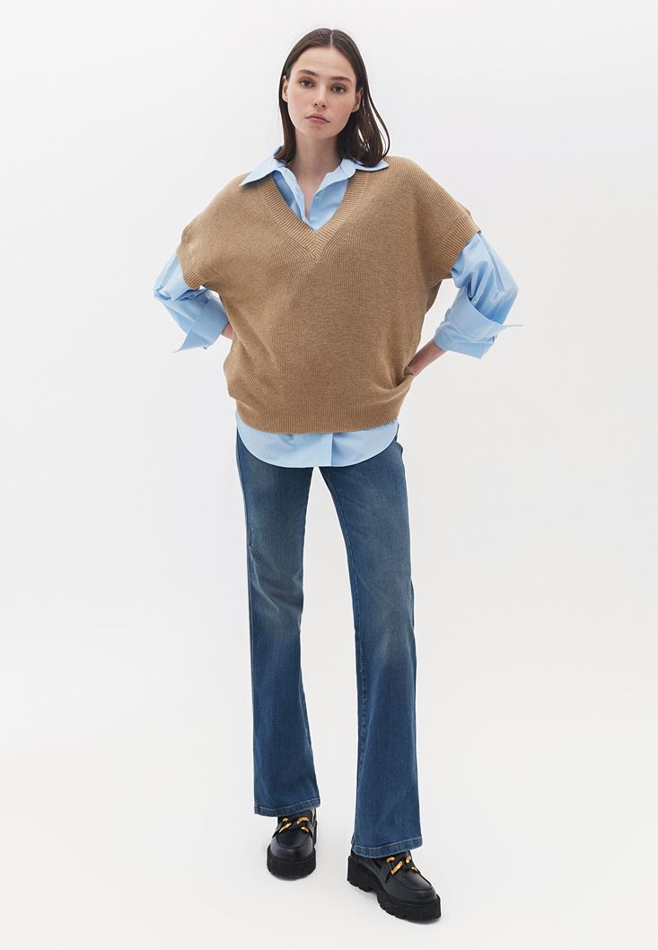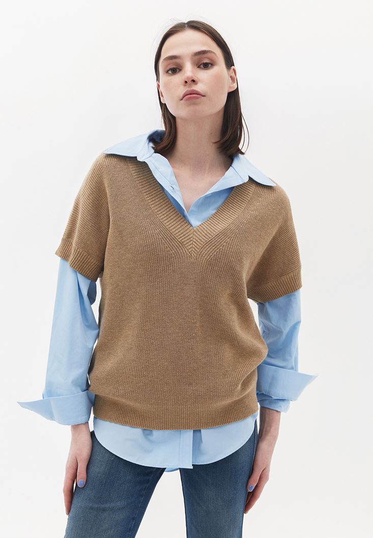 Pamuk karışımlı triko, V yaka, bedenden uzak oversize fit, yaka-kol ucu ve etek ucu jakarlı örgü.