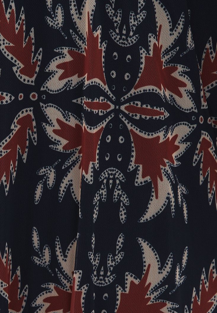 Desenli özel tül doku, V yaka, uzun kollu, içi askılı astarlı, A kesim etek, etek ucu büzgülü, kol ucu lastikli, uzun boy.