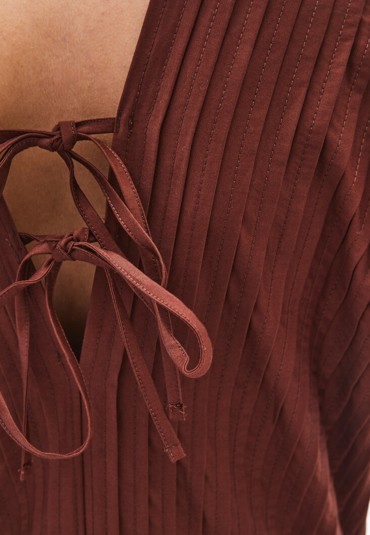 Pamuk ve viskon karışımlı içerik, V yaka, uzun boy kesim, nervür detaylı, sırt kısmı bağlamalı, içi astarsız, kısa kollu, a kesim etek.