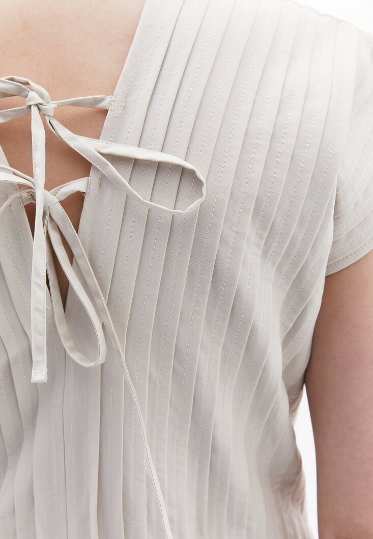 Pamuk ve viskon karışımlı içerik, V yaka, uzun boy kesim, nervür detaylı, sırt kısmı bağlamalı, içi astarsız, kısa kollu, a kesim etek.
