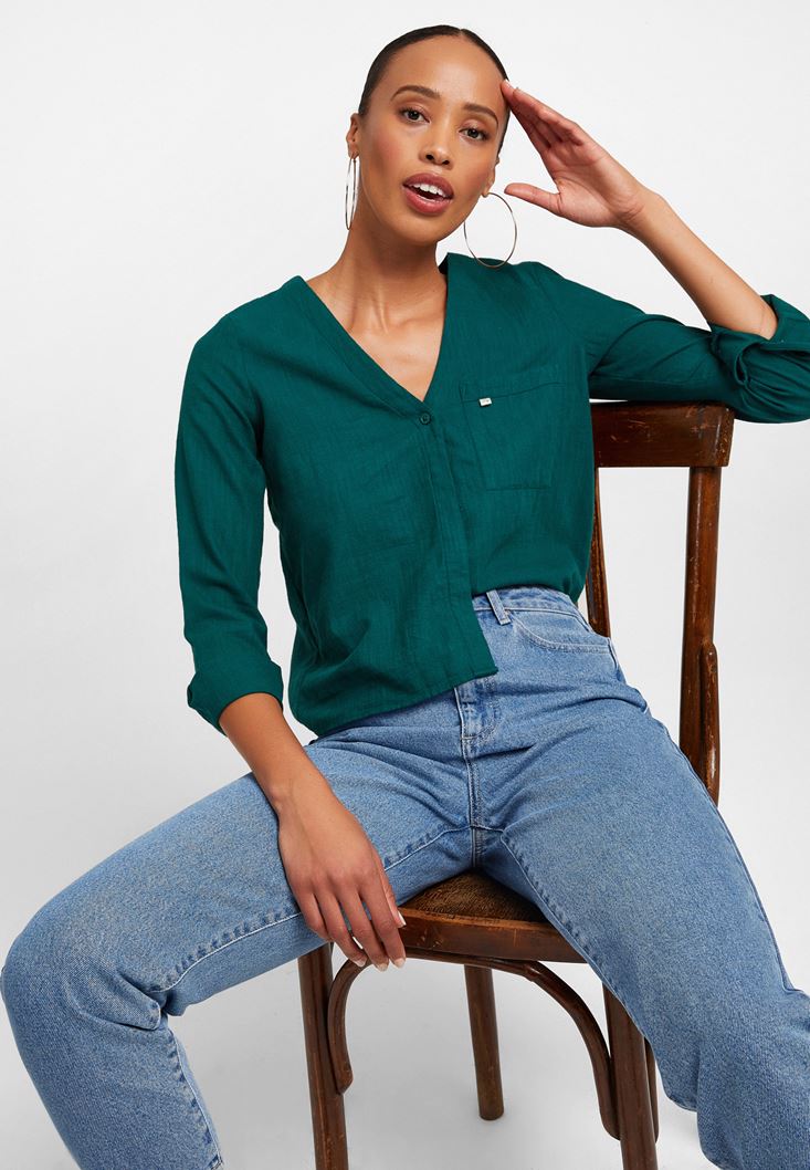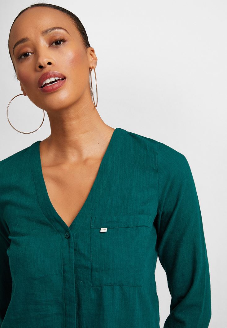 Yeşil V Yaka Uzun Kollu Gömlek