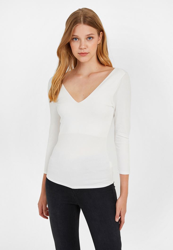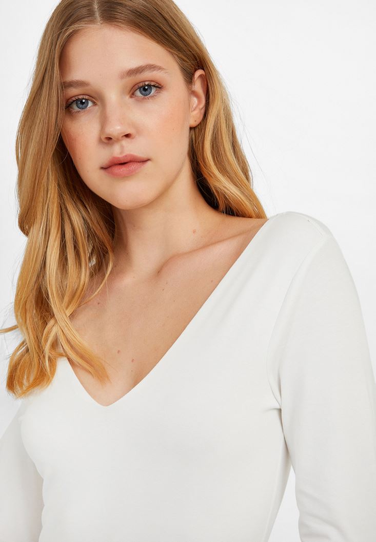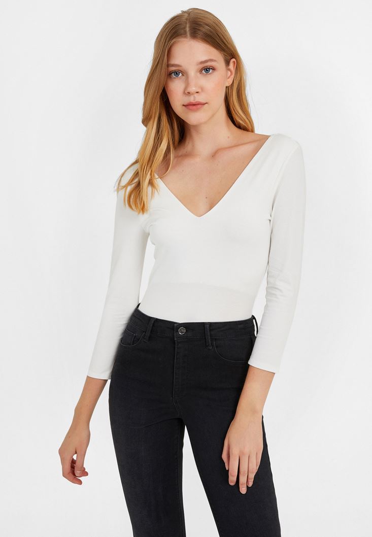 • Bayan Krem V Yaka Uzun Kollu Tişört