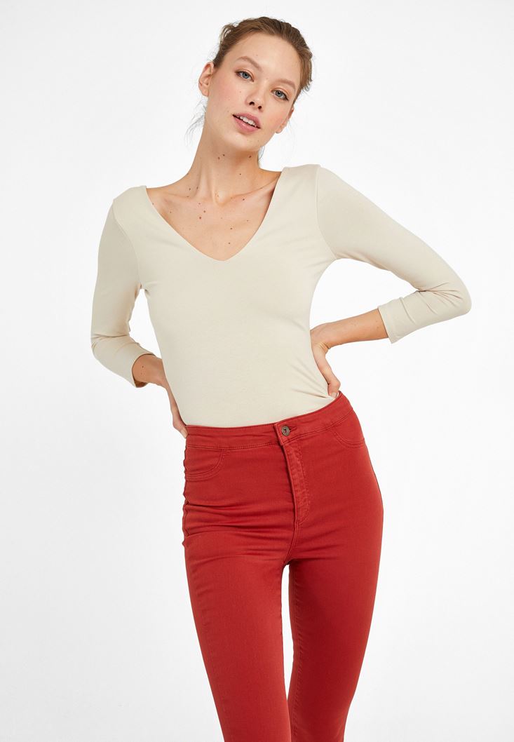 • Bayan Krem V Yaka Uzun Kollu Tişört