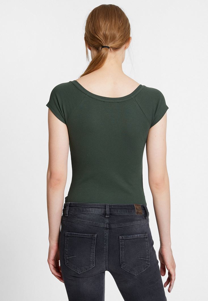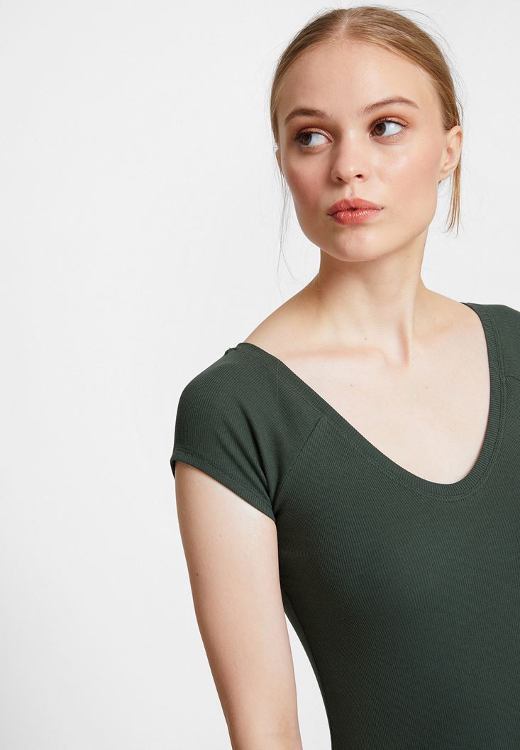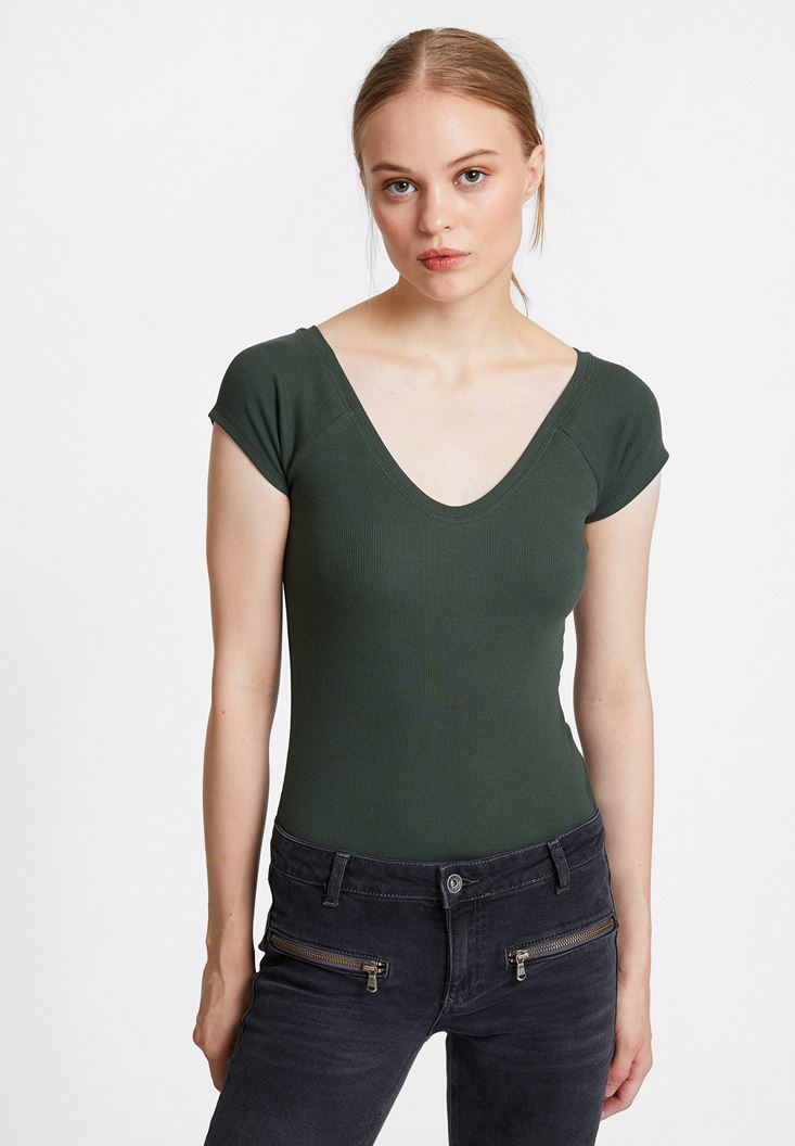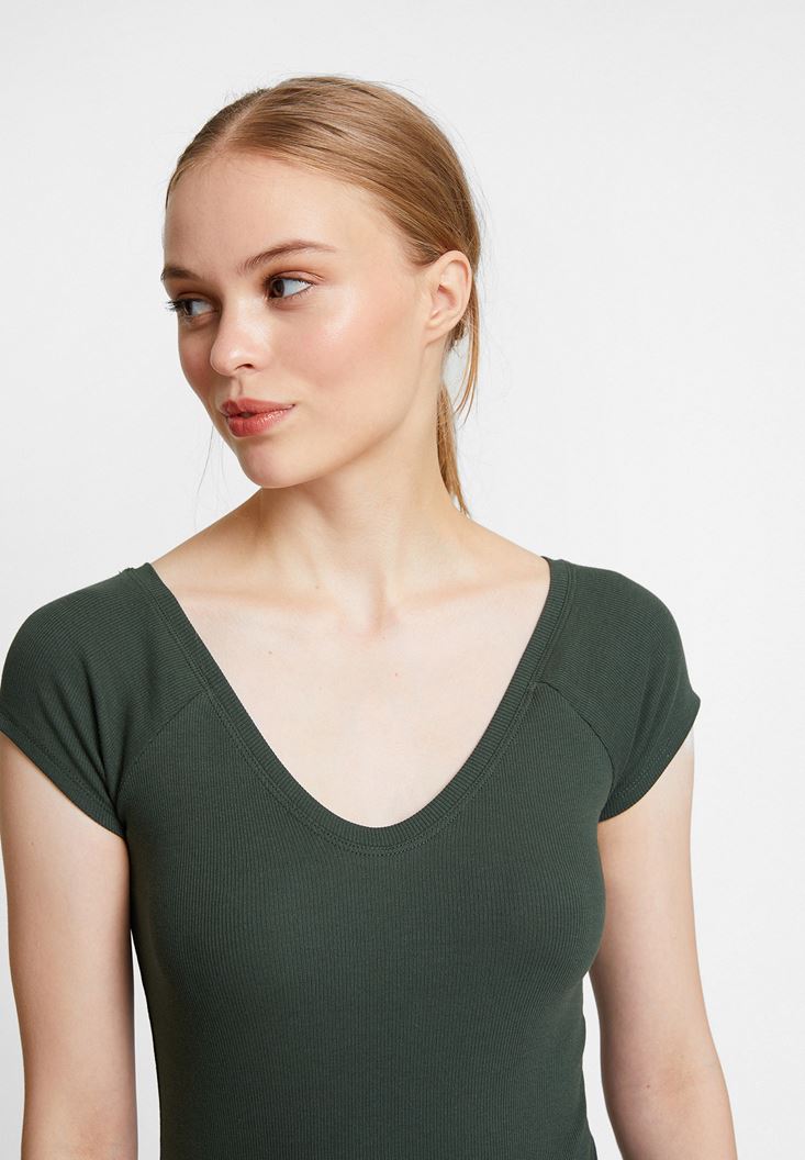 • Bayan Yeşil V Yaka Yarım Kollu Basic
