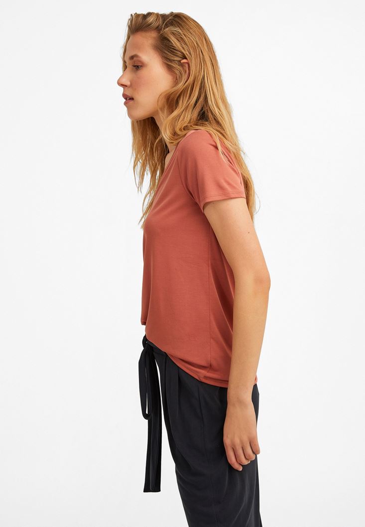 Turuncu V Yaka Yumuşak Dokulu Tişört