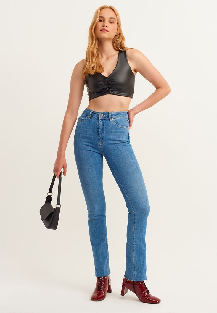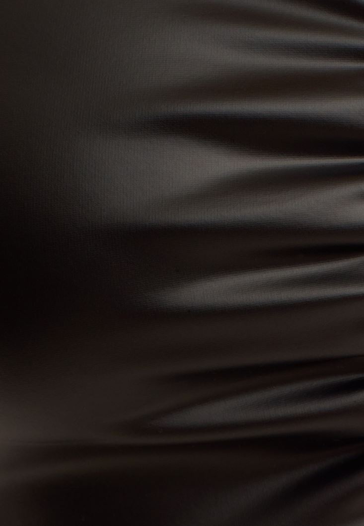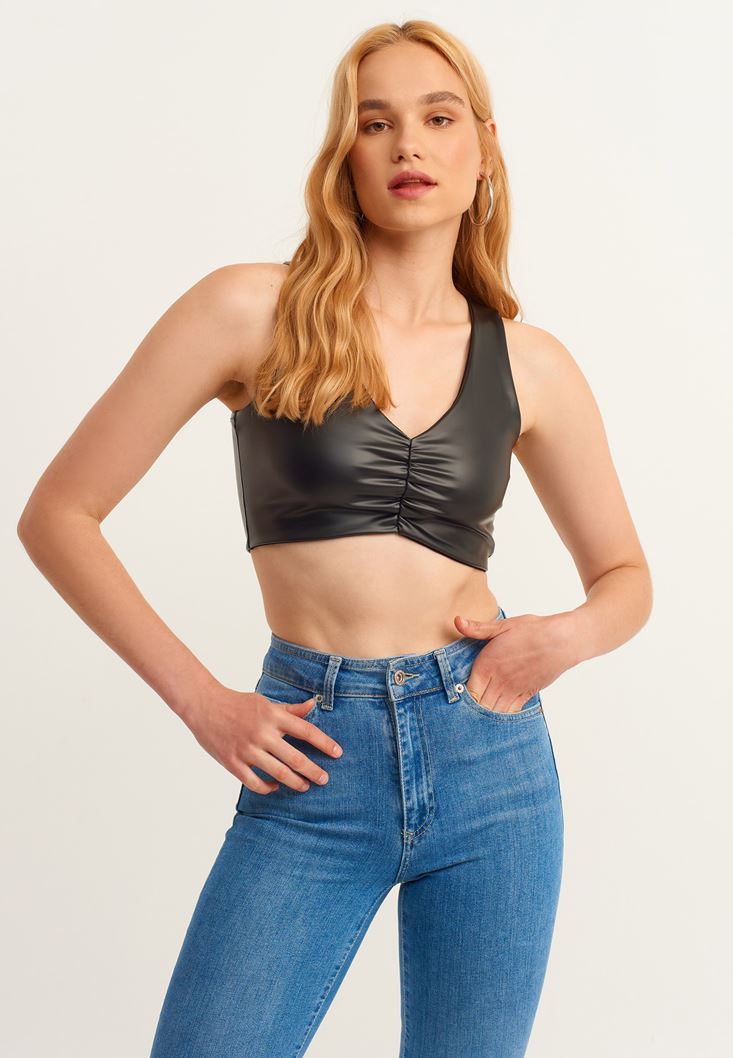 Vegan deri doku, derin V yaka, kalın askılı, crop kesim, ön kısmı büzgü detaylı, bedeni saran form.