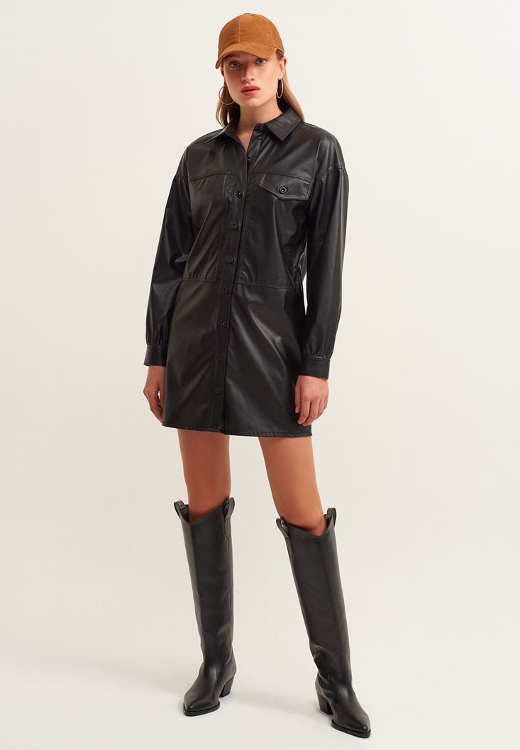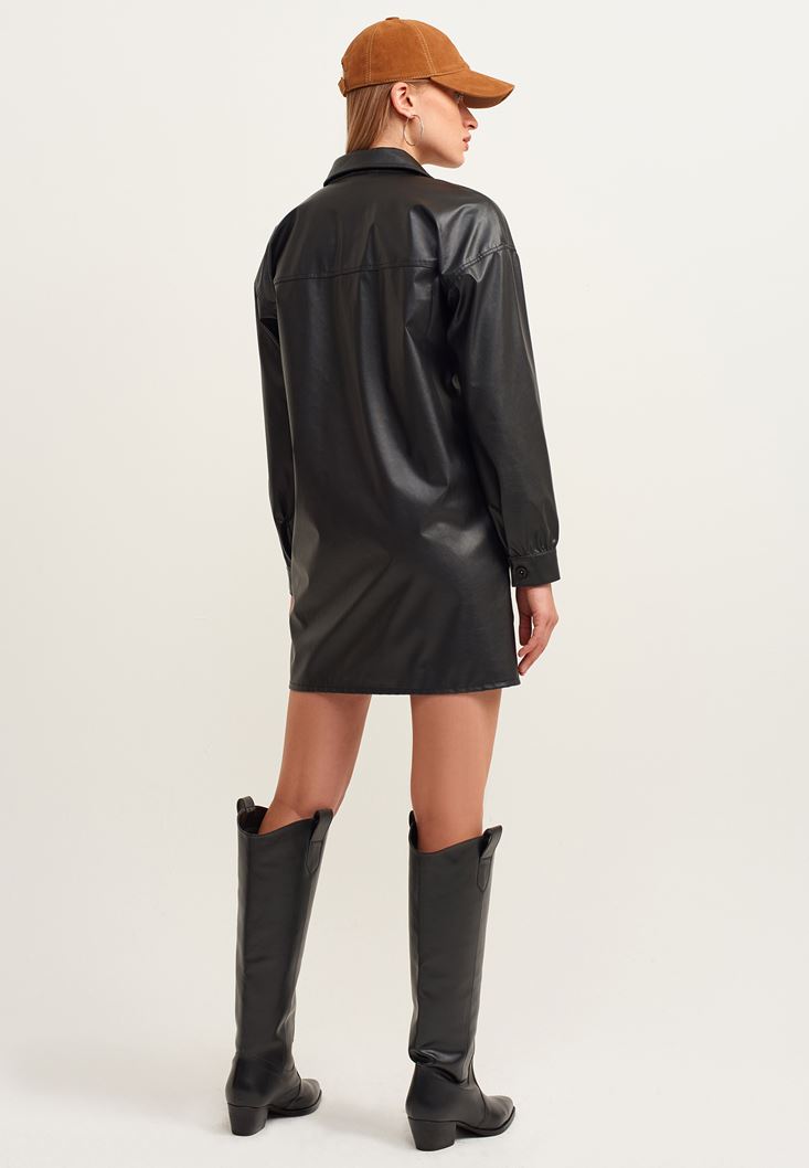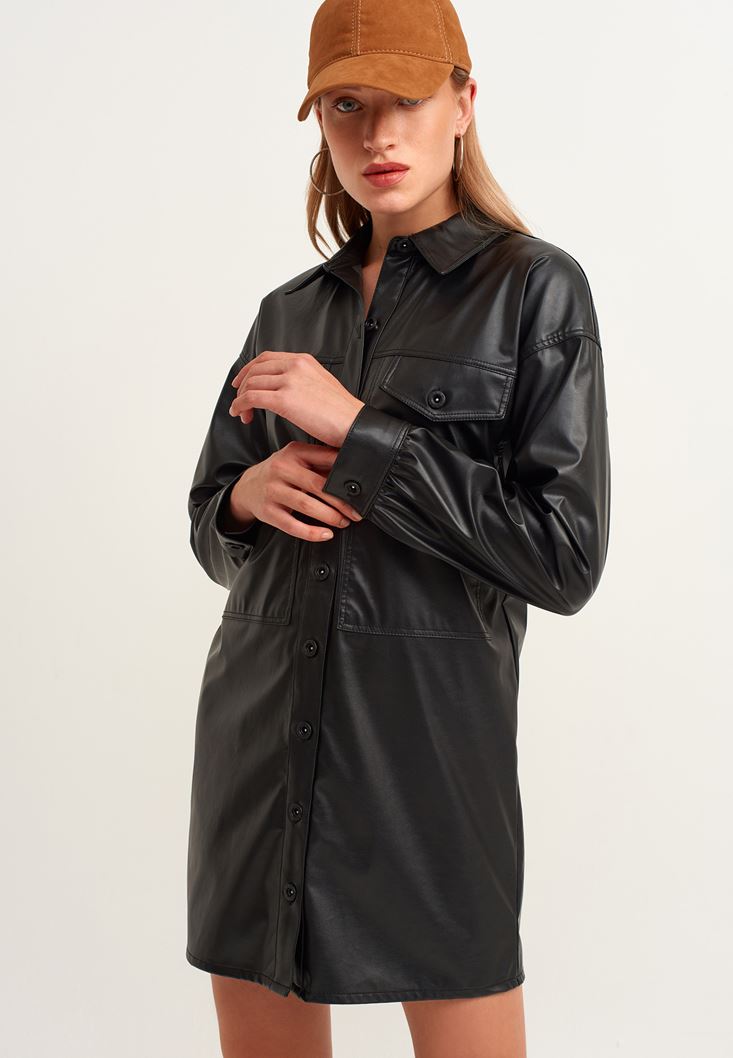 • Bayan Siyah Vegan Deri Gömlek Elbise