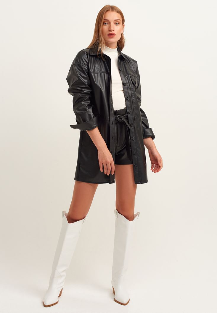 Vegan deri doku, önü tek cepli, mini boy, uzun kollu, önü düğme kapamalı, bedene yakın rahat form, gömlek ya da elbise şeklinde kullanılabilen çok yönlü form.