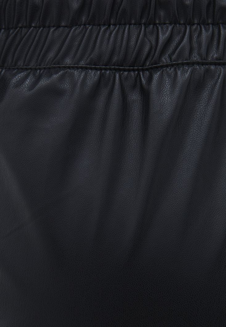 Vegan deri doku, bedene yakın jogger fit, beli ve paçası lastikli, ön kısmı iki cepli, beli bağcık detaylı, ön beden boyunca dikiş detaylı.