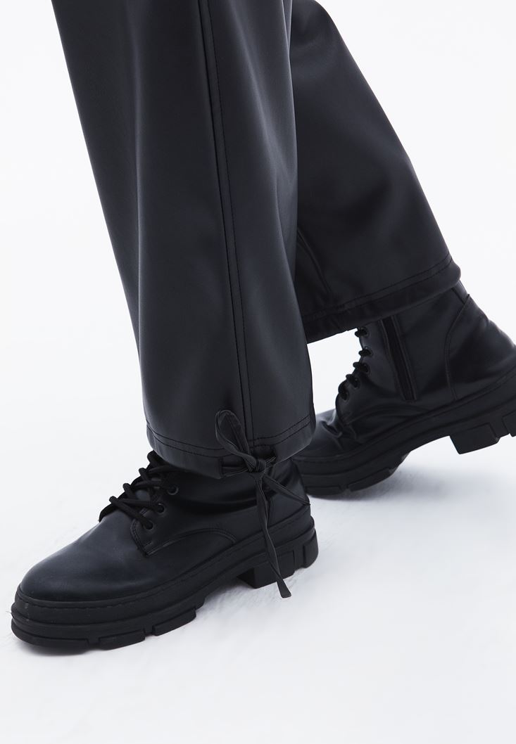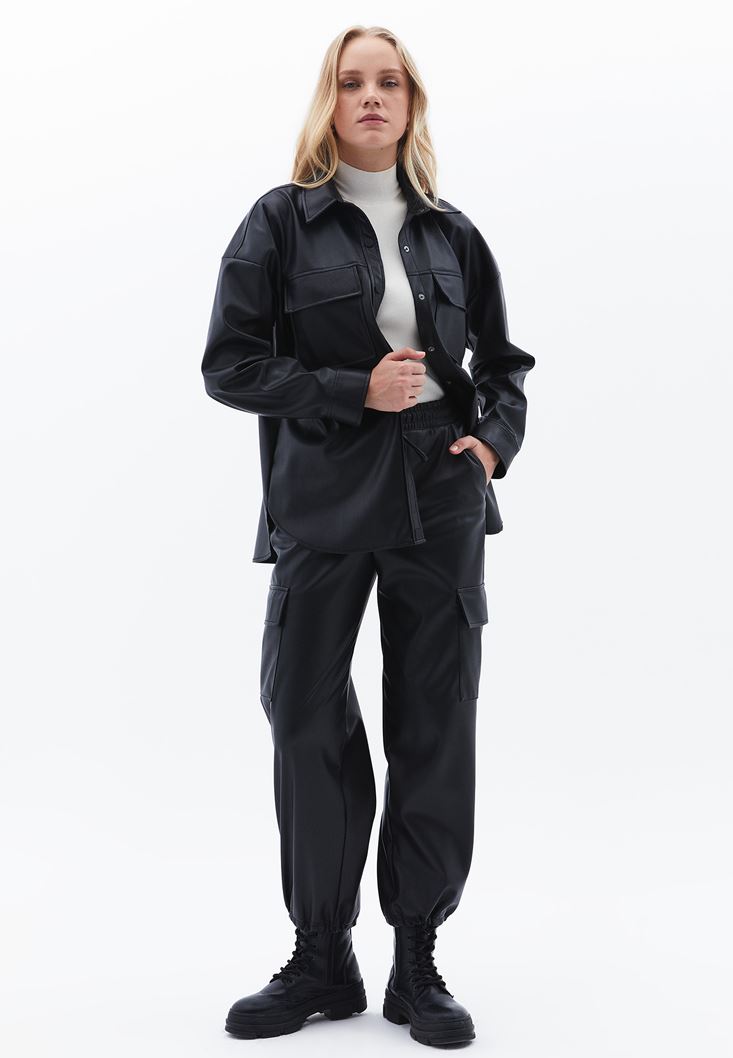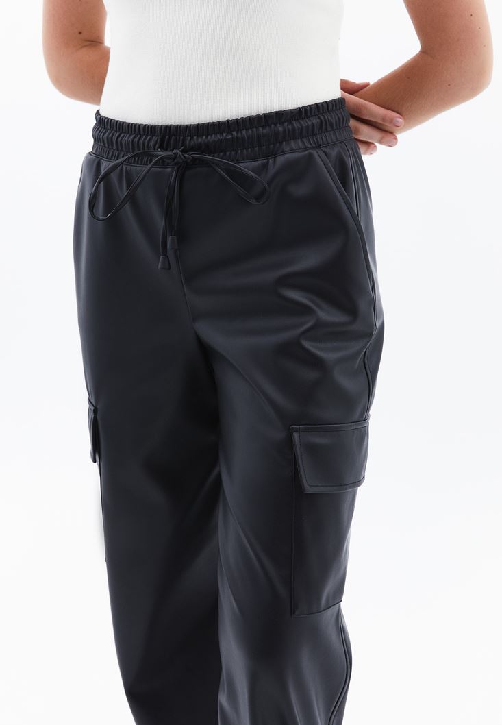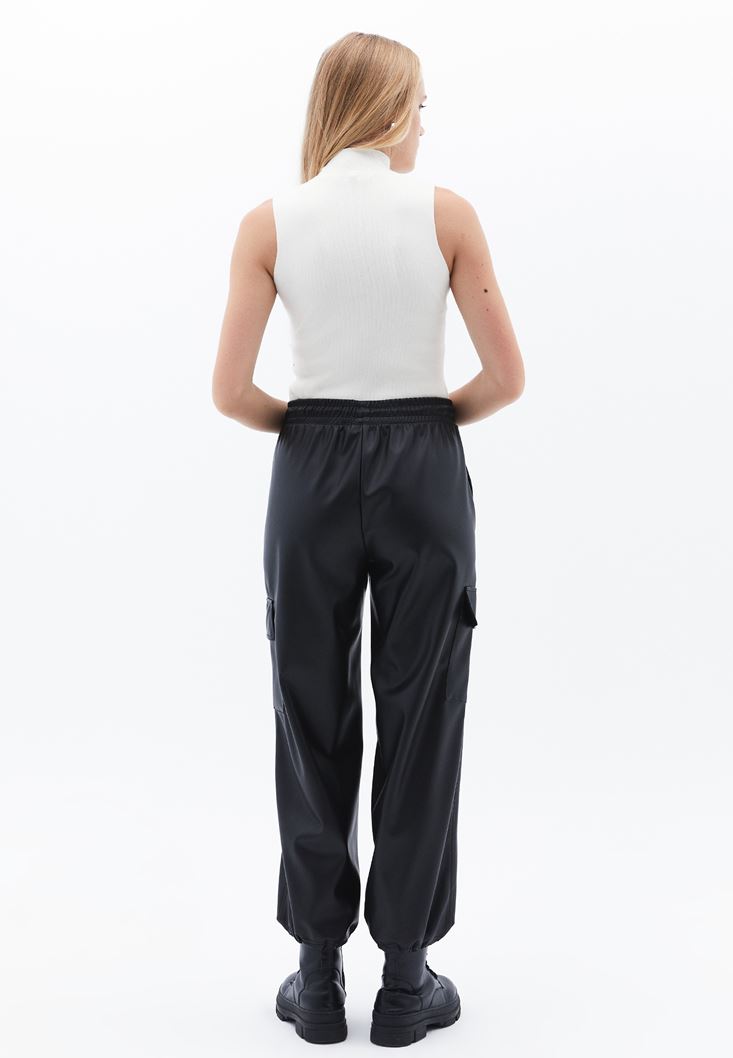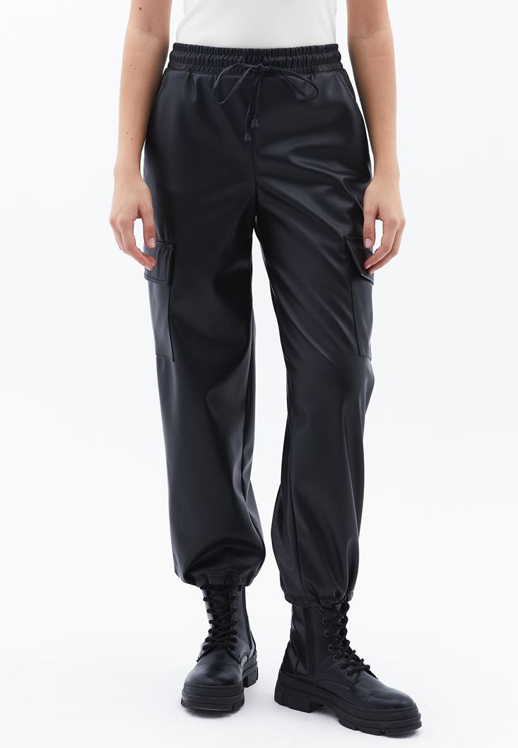 Vegan deri doku, yüksek bel, kargo cep detaylı, bedenden uzak jogger fit, paçası büzgülü veya serbest şekilde kullanılabilir, beli lastikli ve bağcıklı, üst kısmı iki cepli.