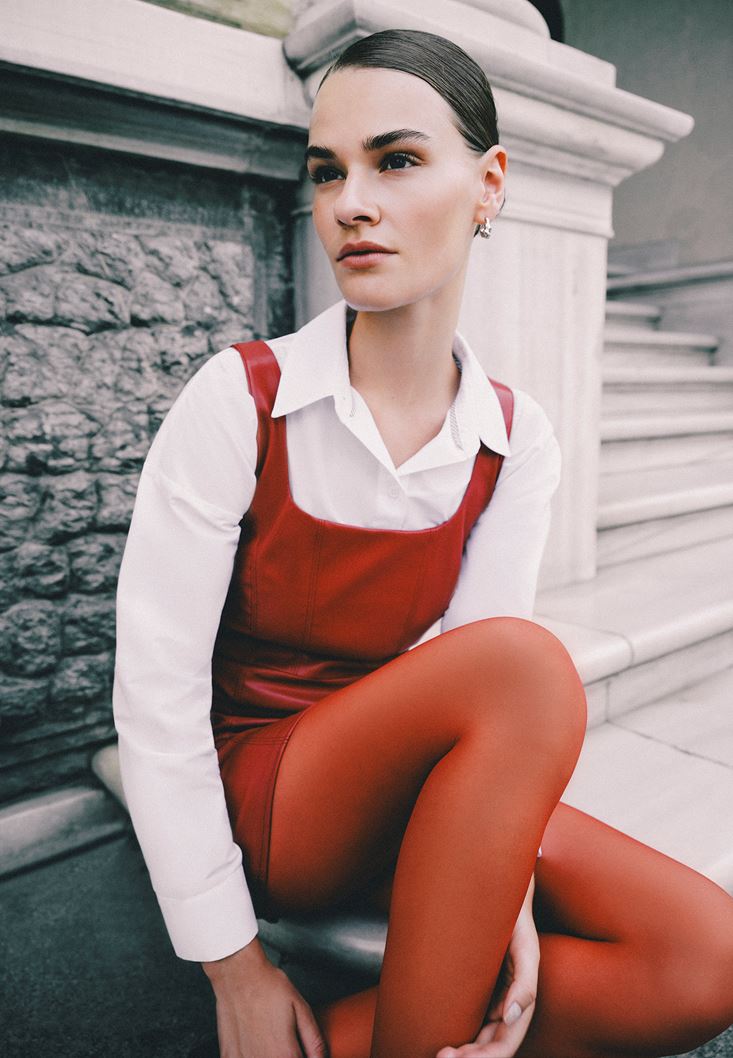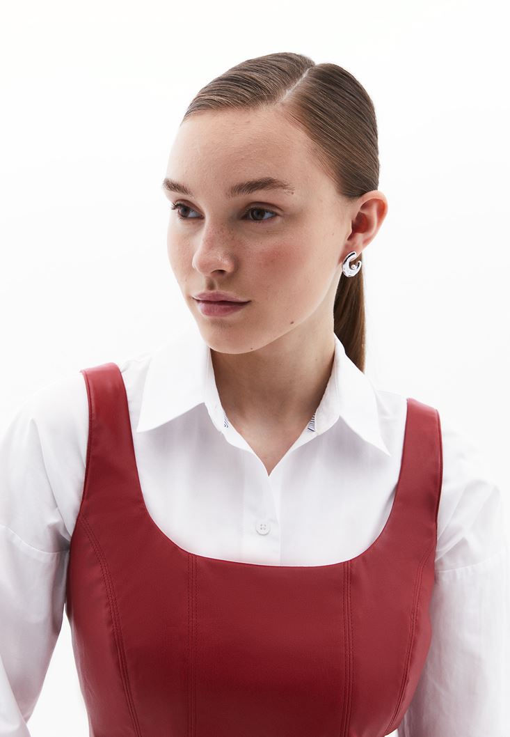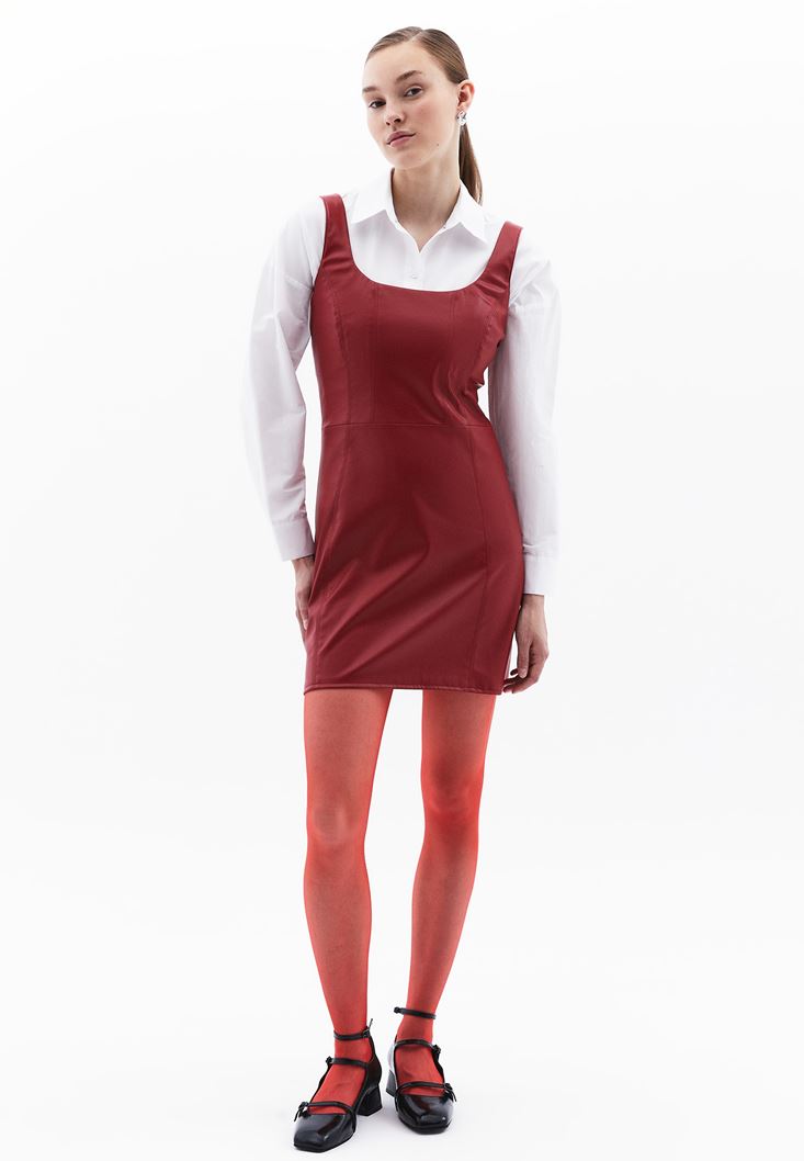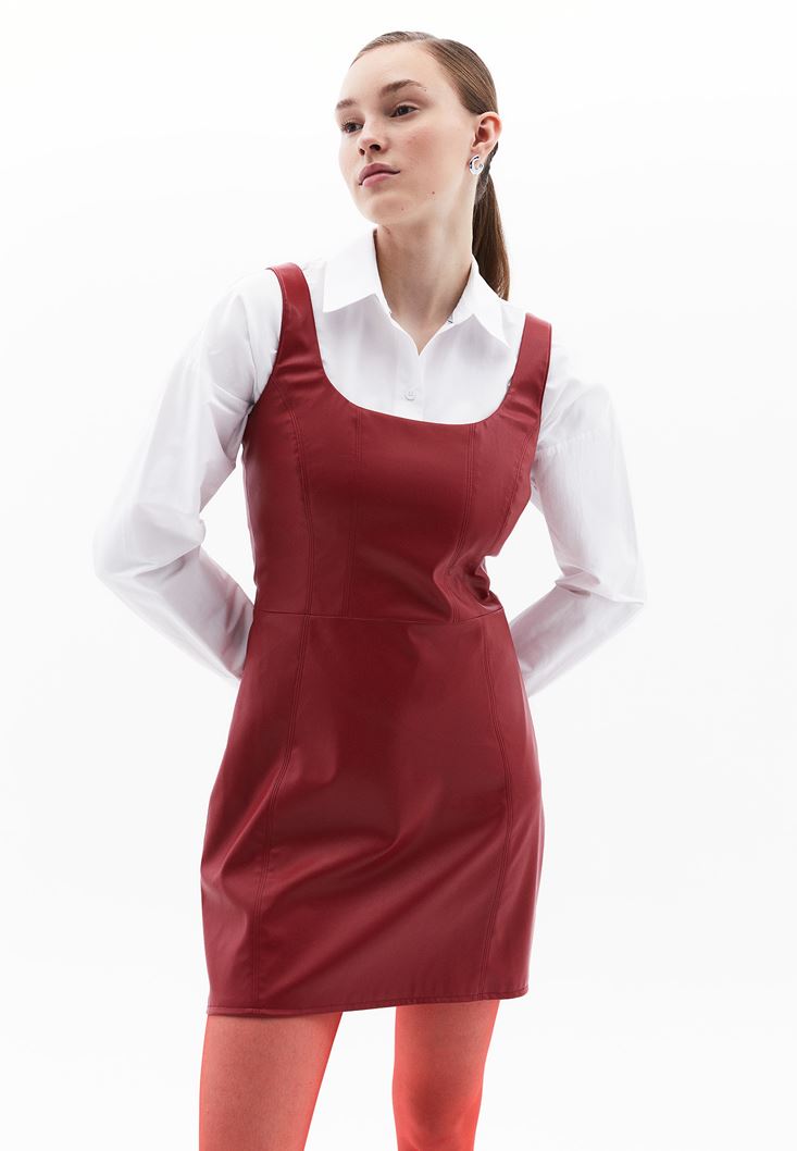 Vegan deri dokunun kırmızı renkle buluşup yarattığı çekici görünümü mini elbise modeliyle deneyimleyebilirsiniz! Sonbahar ve kış aylarında oluşturacağınız kombinlerde feminen bir hava yakalamak için vegan deri elbise modeli size yardımcı olabilir… Onu klasik beyaz gömleklerle ve mary jane ayakkabılarla buluşturup stilinizi güçlendirebilirsiniz!🎀