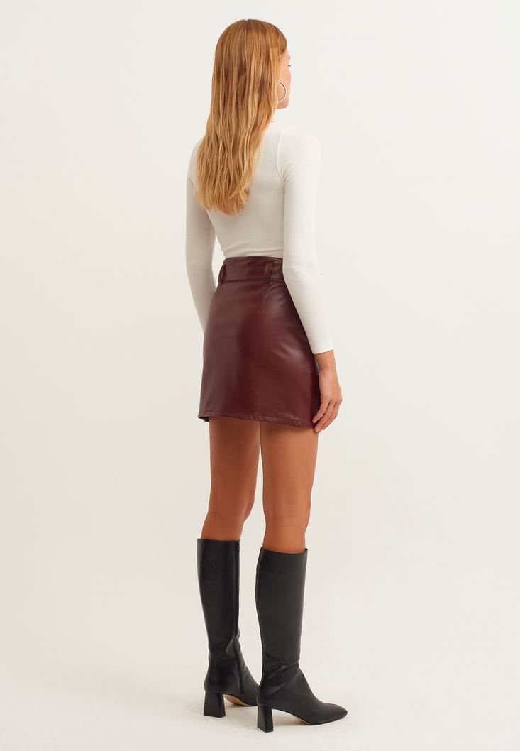Vegan deri doku, A-line fit, bedene yakın rahat kesim, kendi kumaşından kemerli, ön kısmı iki cepli, mini boy.