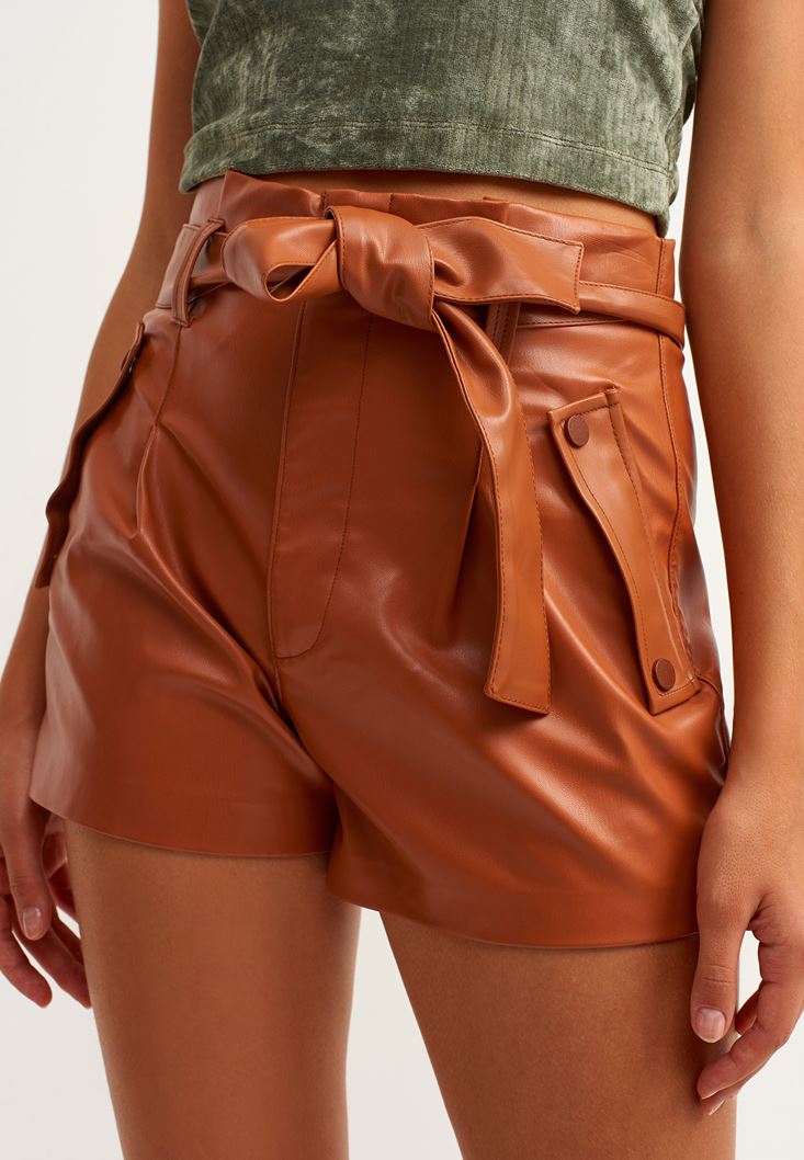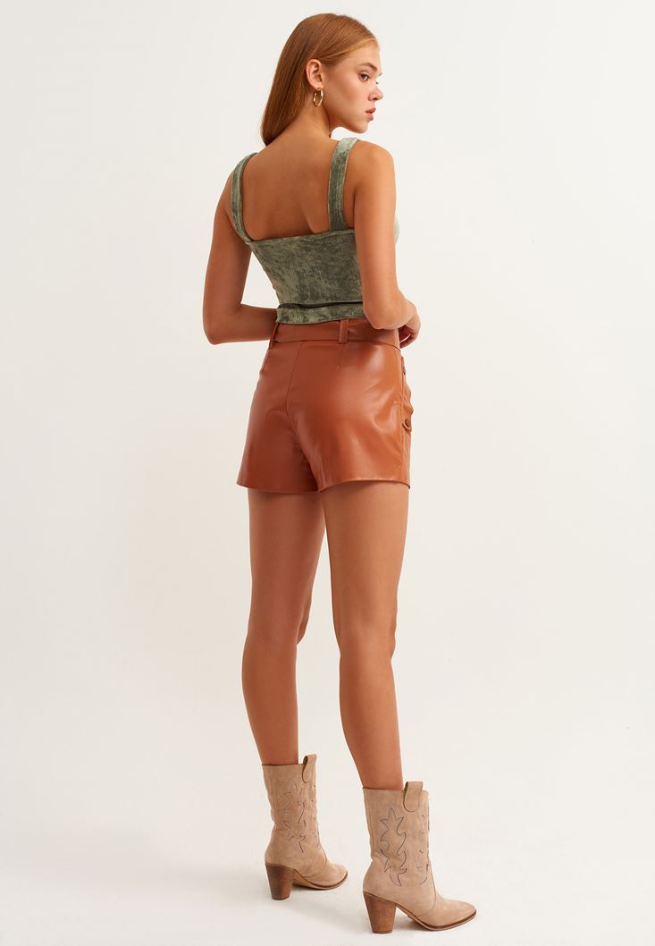 Kahverengi Vegan Deri Mini Şort
