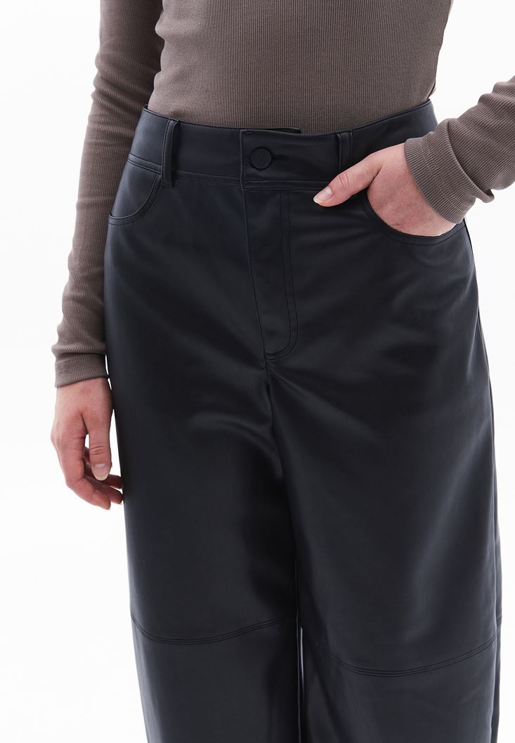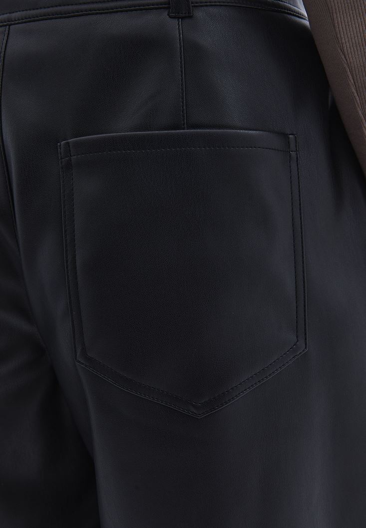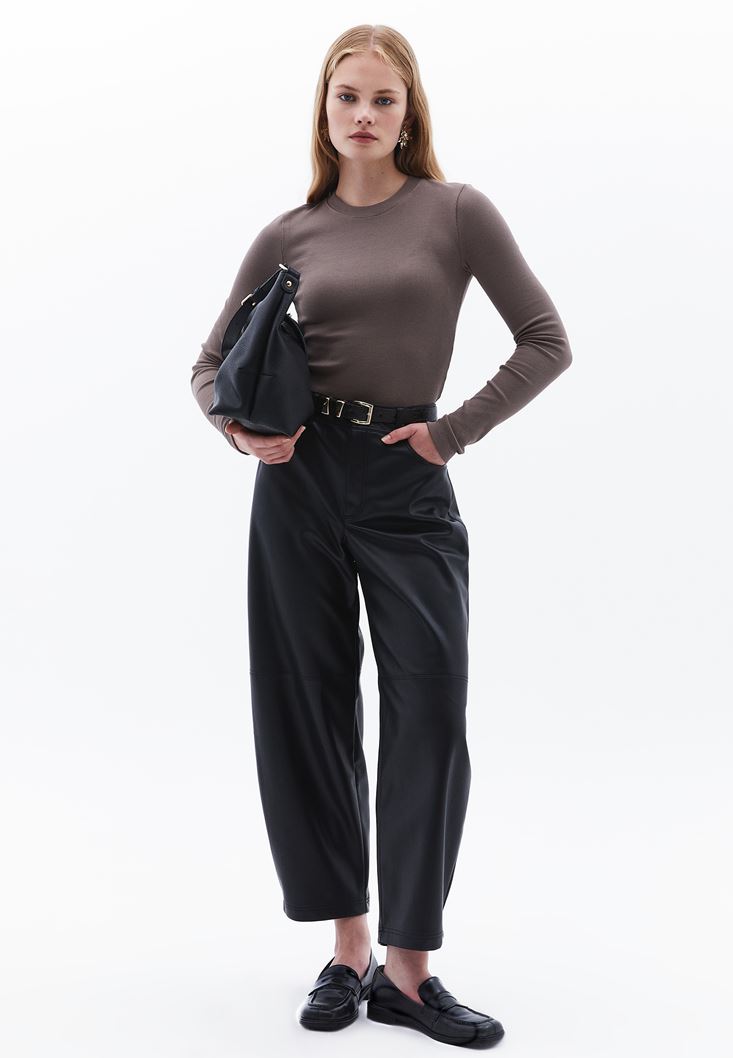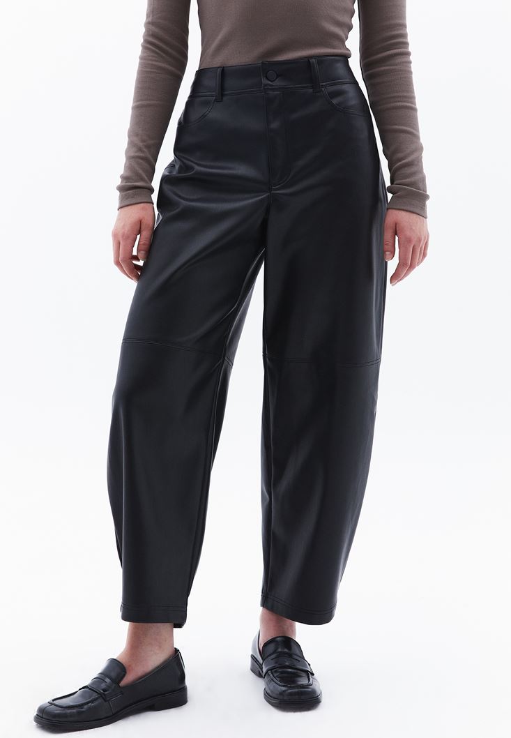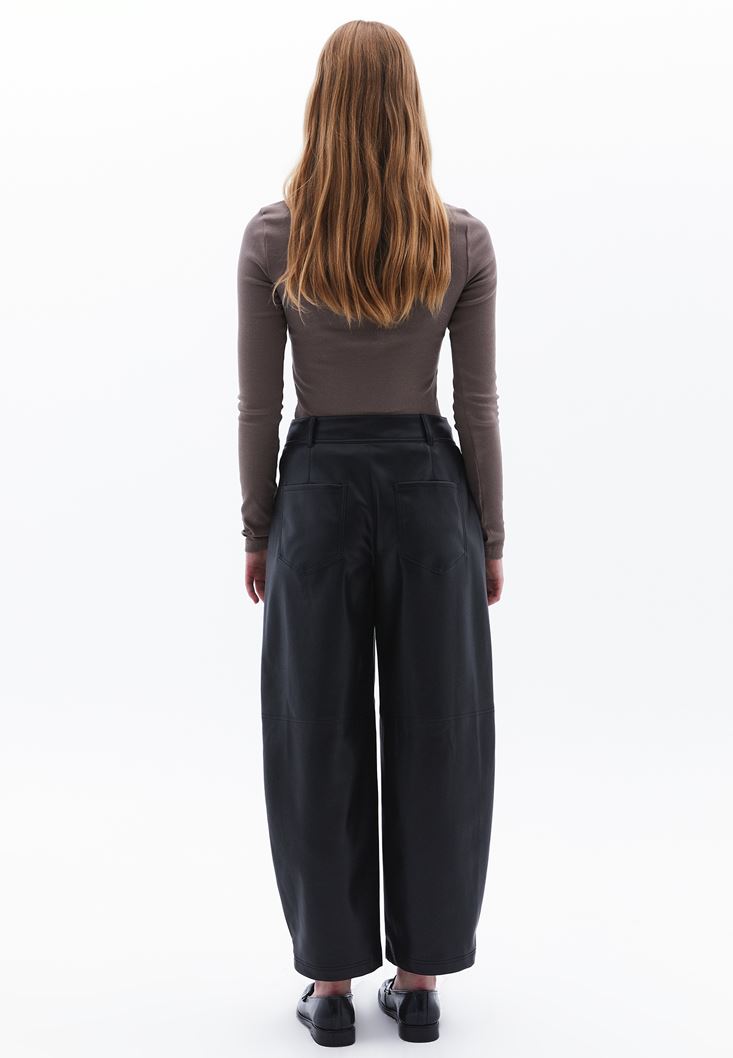 • Bayan Siyah Vegan Deri Orta Bel Barrel-Fit Pantolon