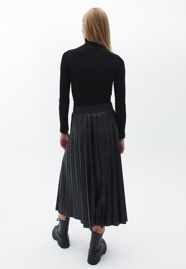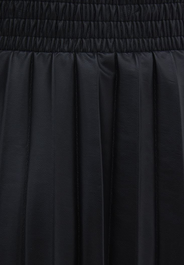 Siyah Vegan Deri Pileli Midi Etek