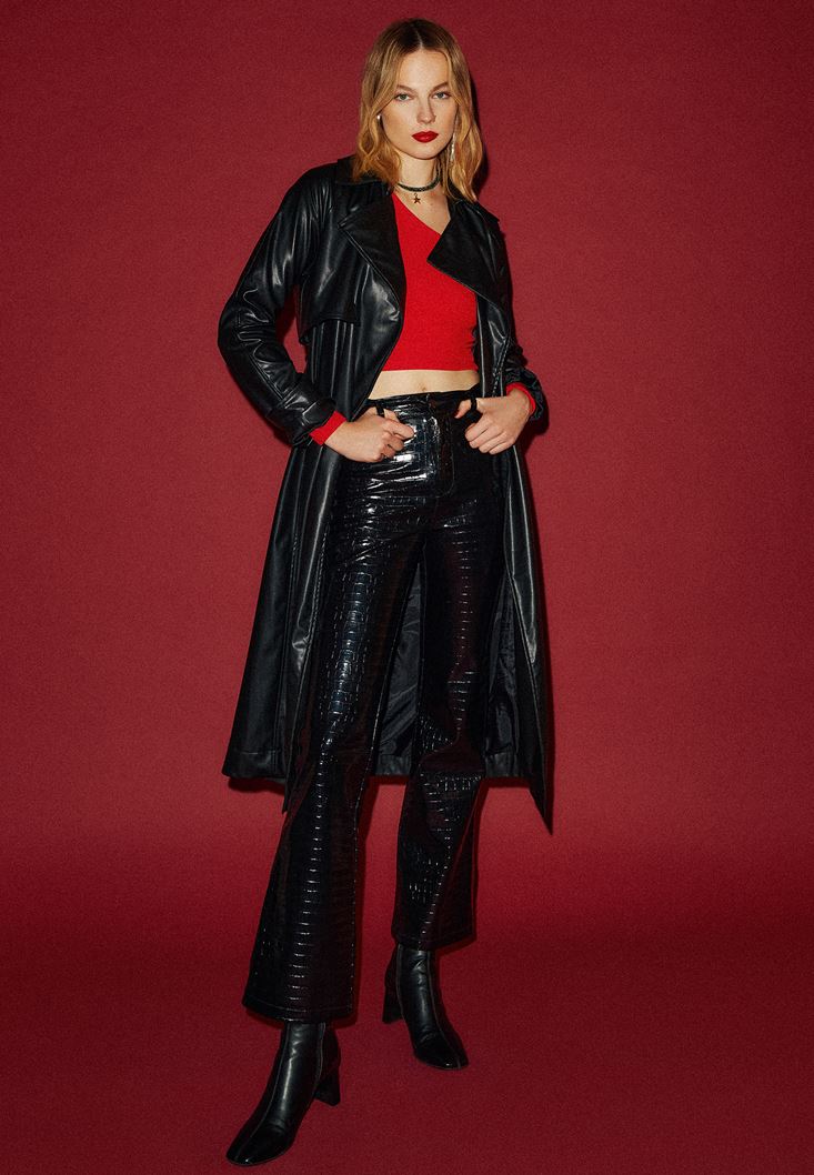 • Bayan Siyah Vegan Deri Uzun Ceket